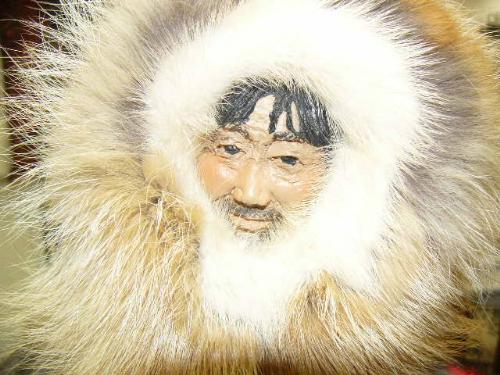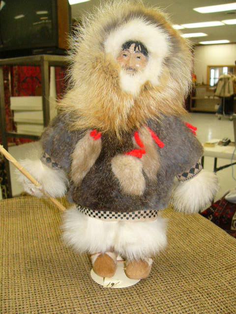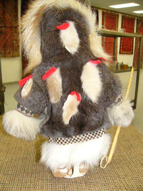 15" Eskimo Doll with wood face and harpoon wearing fur parka and mukluks (74)