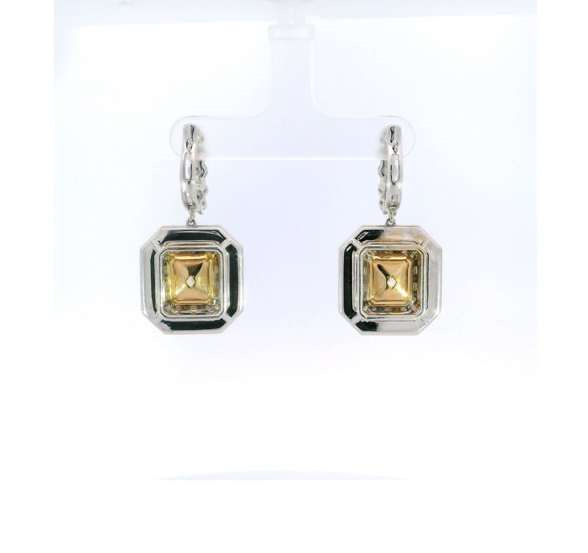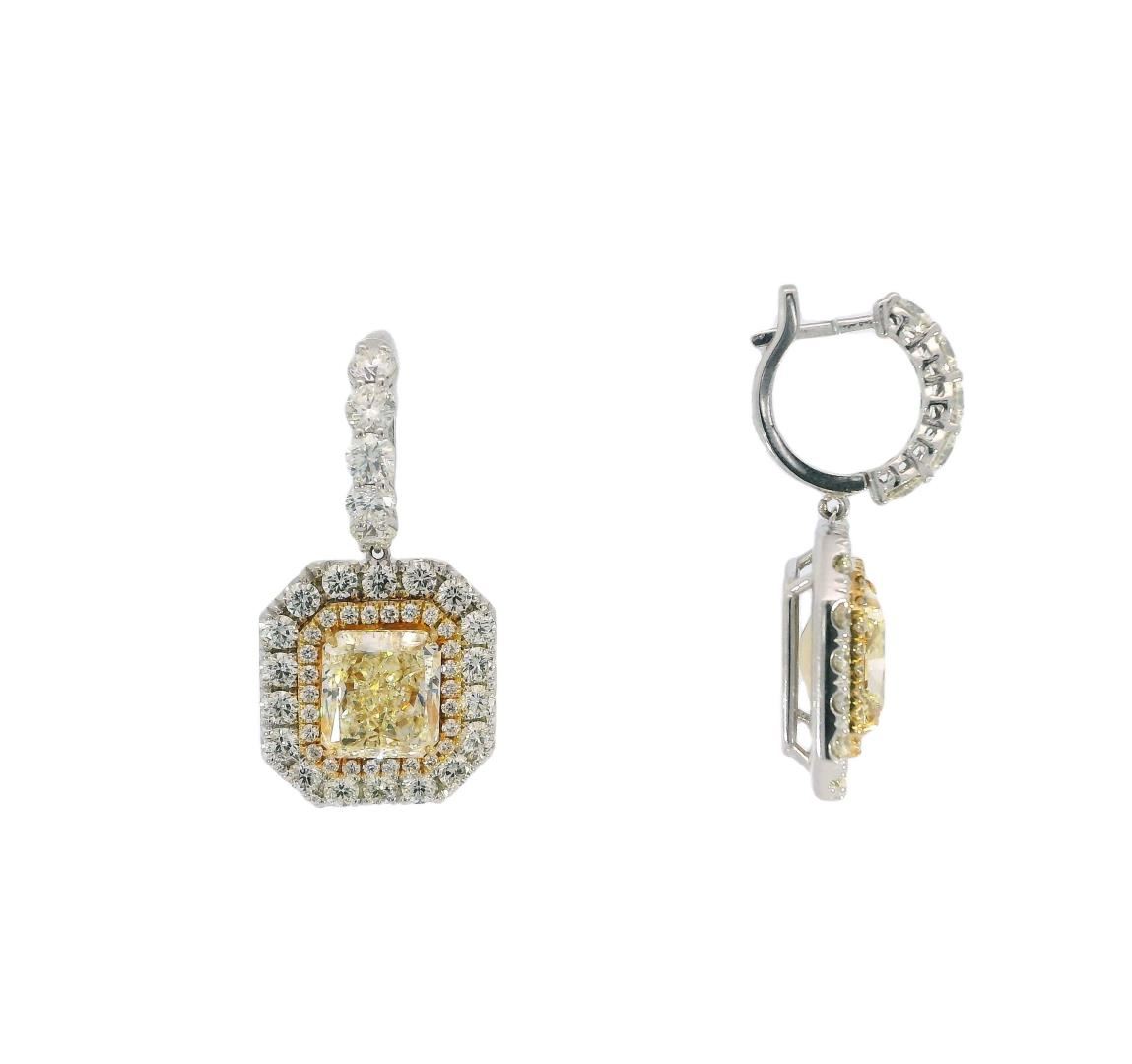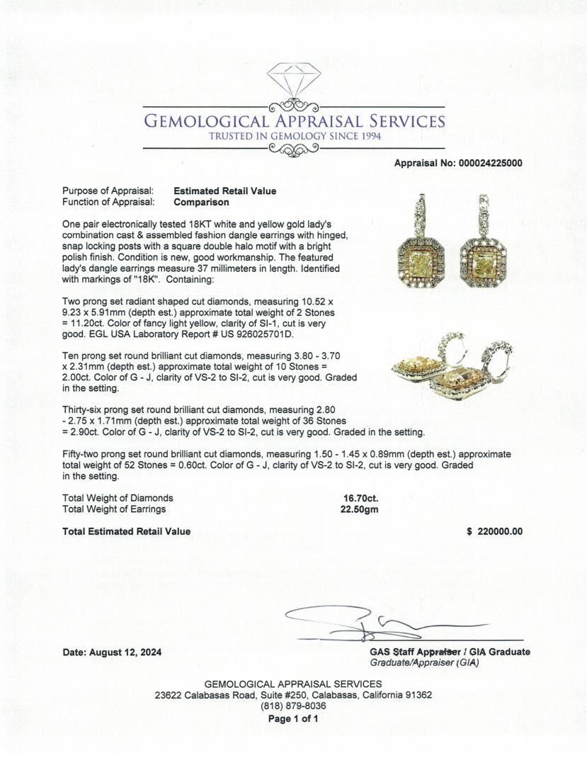 These dangle earrings feature 11.20ct of fancy light yellow radiant cut diamonds with SI-1 clarity, surrounded by 5.50ct of round brilliant diamonds for extra sparkle. She will look stunning in these! One pair electronically tested 18KT white and yellow gold lady's combination cast & assembled fashion dangle earrings with hinged, snap locking posts with a square double halo motif with a bright polish finish. Condition is new, good workmanship. The featured lady's dangle earrings measure 37 millimeters in length. Identified with markings of 18K. Containing: Two prong set radiant shaped cut diamonds, measuring 10.52 x 9.23 x 5.91mm (depth est.), approximate total weight of 2 Stones = 11.20ct. Color of fancy light yellow, clarity of SI-1, cut is very good. EGL USA Laboratory Report # US 926025701D. Ten prong set round brilliant cut diamonds, measuring 3.80 - 3.70 x 2.31mm (depth est.), approximate total weight of 10 Stones = 2.00ct. Color of G - J, clarity of VS-2 to SI-2, cut is very good. Graded in the setting. Thirty-six prong set round brilliant cut diamonds, measuring 2.80 - 2.75 x 1.71mm (depth est.), approximate total weight of 36 Stones = 2.90ct. Color of G - J, clarity of VS-2 to SI-2, cut is very good. Graded in the setting. Fifty-two prong set round brilliant cut diamonds, measuring 1.50 - 1.45 x 0.89mm (depth est.), approximate total weight of 52 Stones = 0.60ct. Color of G - J, clarity of VS-2 to SI-2, cut is very good. Graded in the setting. Total Weight of Diamonds: 16.70ct. Total Weight of Earrings: 22.50gm Total Estimated Retail Value: $220000.00 Appraisal No: 000024225000