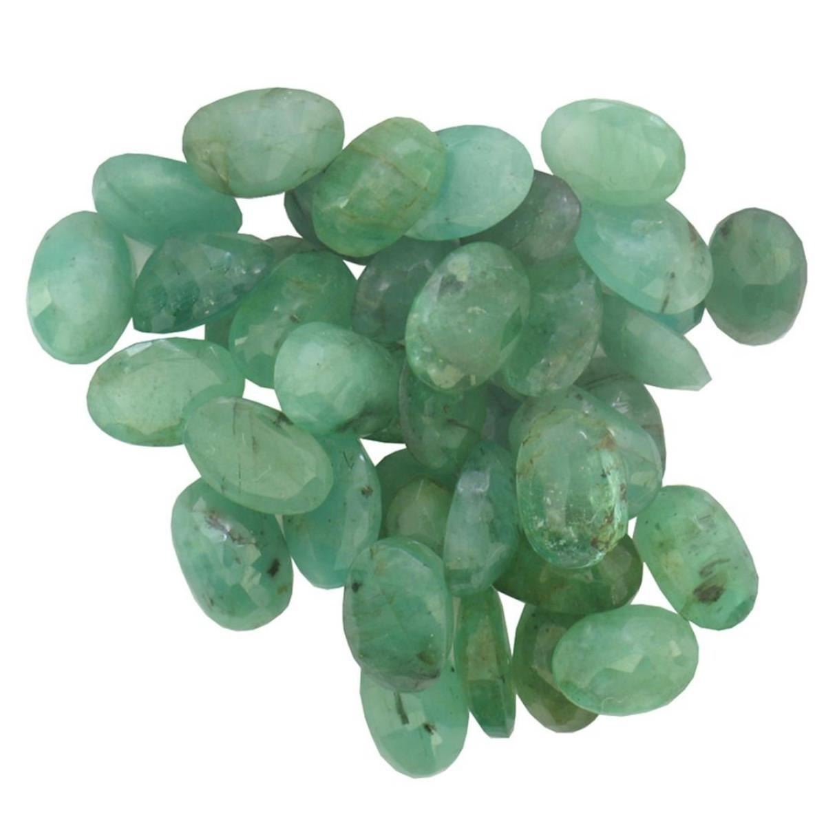 Forty oval mixed cut natural emeralds exact total weight 17.18ct., clarity is heavily included, type III, medium dark, very slightly grayish, very slightly bluish green color, (GIA vslbG 6/3), cut is good. Westfield Appraised.