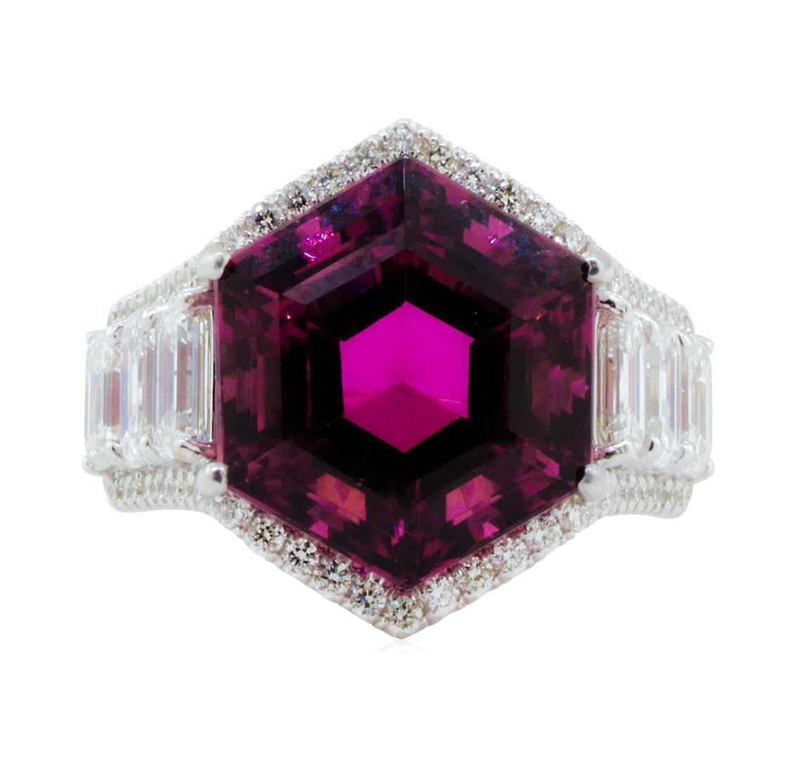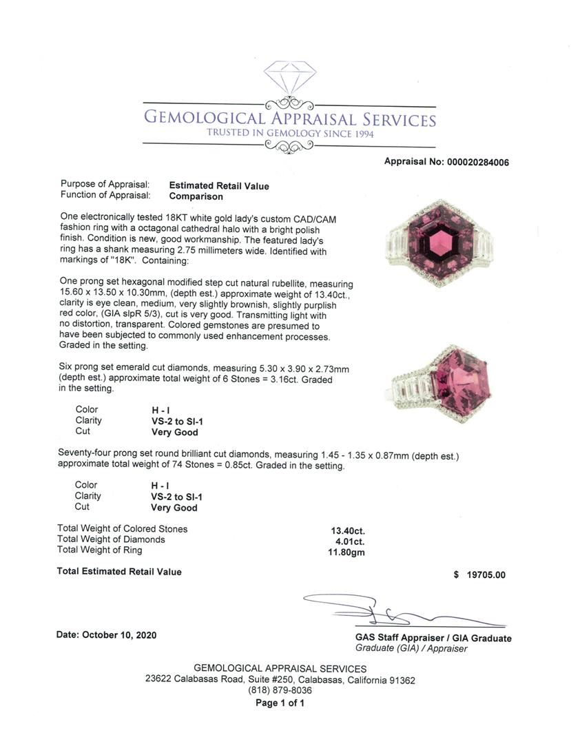 One electronically tested 18KT white gold lady's custom CAD/CAM fashion ring with a octagonal cathedral halo with a bright polish finish. Condition is new, good workmanship. The featured lady's ring has a shank measuring 2.75 millimeters wide. Identified with markings of "18K". Containing:One prong set hexagonal modified step cut natural rubellite, measuring15.60 x 13.50 x 10.30mm, (depth est.) approximate weight of 13.40ct., clarity is eye clean, medium, very slightly brownish, slightly purplish red color, (GIA slpR 5/3), cut is very good. Transmitting light withno distortion, transparent. Colored gemstones are presumed to have been subjected to commonly used enhancement processes. Graded in the setting.Six prong set emerald cut diamonds, measuring 5.30 x 3.90 x 2.73mm (depth est.) approximate total weight of 6 Stones = 3.16ct. Gradedin the setting. Color Clarity Cut H - IVS-2 to 51-1Very Good Seventy-four prong set round brilliant cut diamonds, measuring 1.45 - 1.35 x 0.87mm (depth est.) approximate total weight of 74 Stones = 0.85ct. Graded in the setting. Color Clarity Cut H - IVS-2 to SI-1Very Good Total Weight of Colored Stones Total Weight of Diamonds Total Weight of RingTotal Estimated Retail Value 13.40ct.4.01ct.11.80gm $ 19705.00