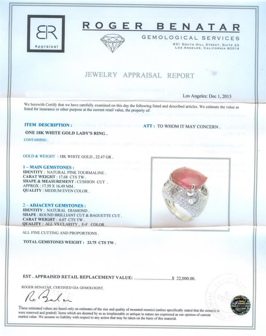 One 18KT White Gold Lady's Ring. Containing: Gold & Weight: 18K White Gold, 22.47 grams. Main Gemstones: Identity: Natural Pink Tourmaline. Carat Weight: 17.68 cts tw. Shape & Measurement: Cushion Cut. Approx: 17.59 x 16.49 mm. Quality: Medium Even Color. Adjacent Gemstones: Identity: Natural Diamond. Shape: Round Brilliant Cut & Baguette Cut. Carat Weight: 6.07 cts tw. Quality: All VS Clarity, E-F Color. All fine cutting and proportions. Total gemstones weight: 23.75 cts tw. RBGS Appraised.