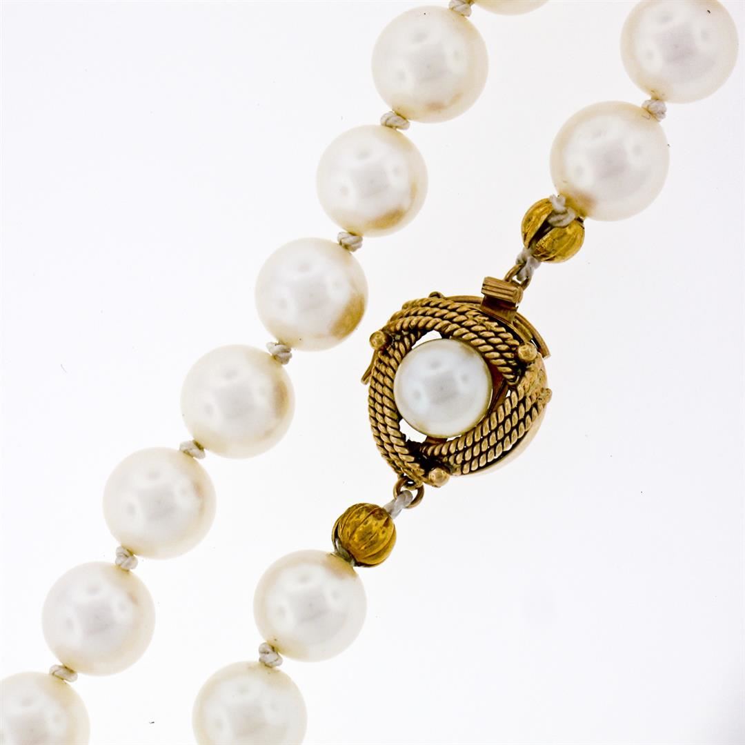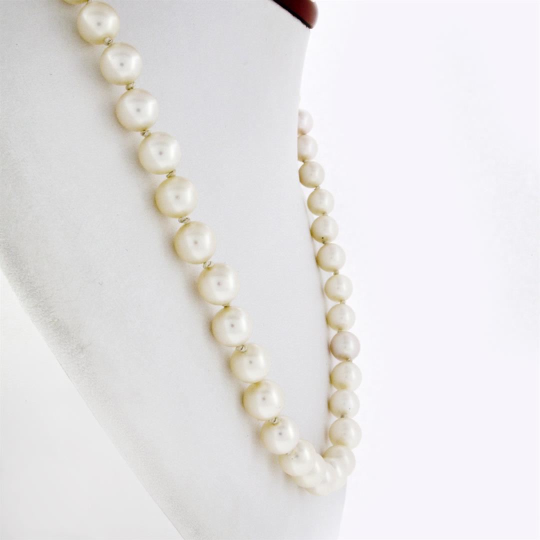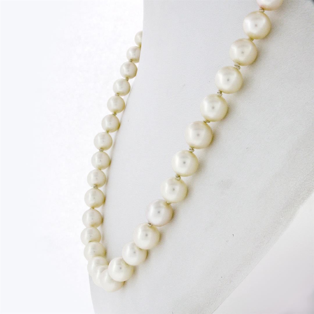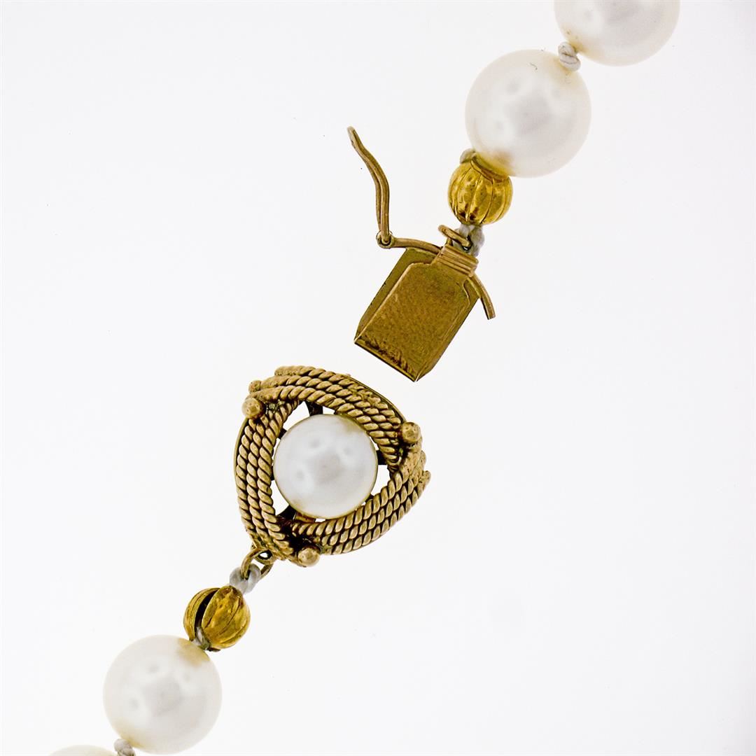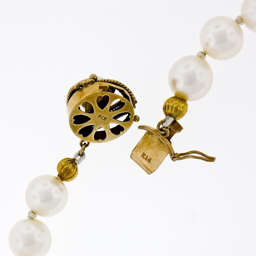 An estate pearl strand necklace with 14k yellow gold clasp, featuring 51 round shape natural cultured pearls (7.5 - 8.0mm). 18 inch strand bead link chain, 35.72 grams total weight, clasp width measures 12.50mm.