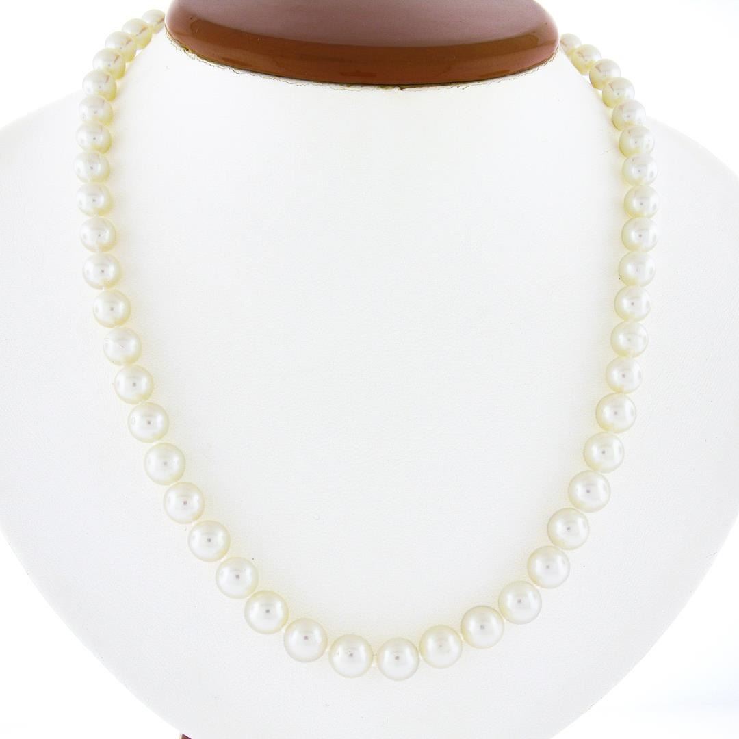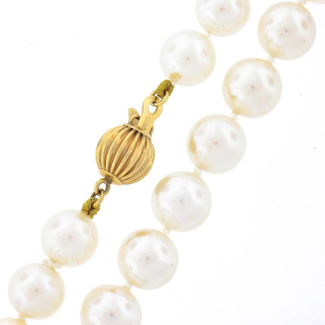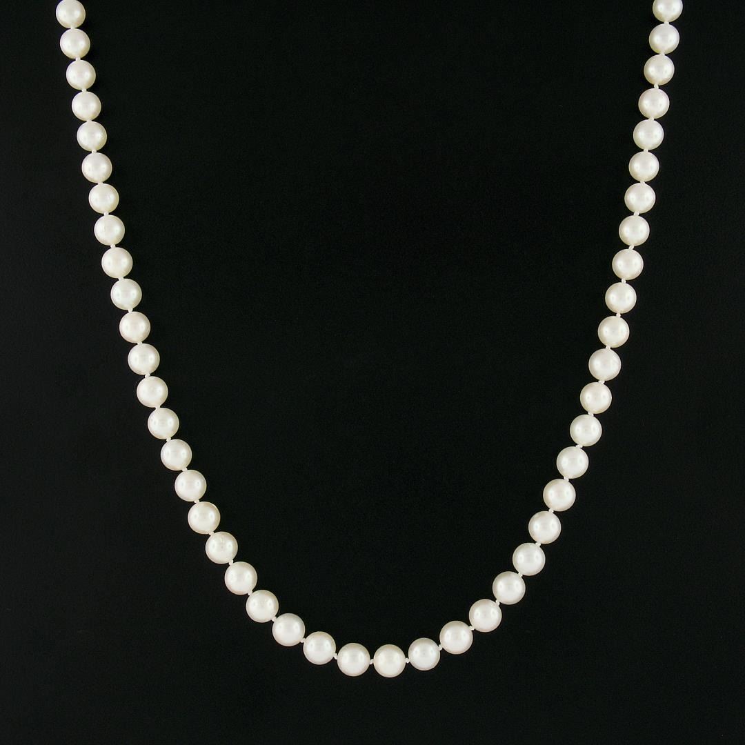 A strand necklace with 14k yellow gold clasp, with 56 round shape cultured pearls (7.0-7.5mm each). It weighs a total of 31.74 grams, measures 7.5mm wide, and measures 18 inches in length.