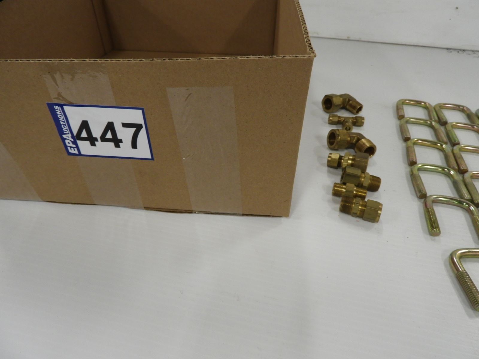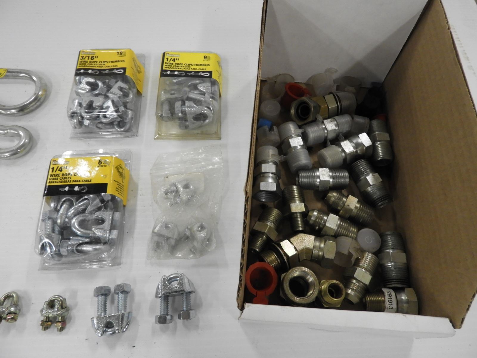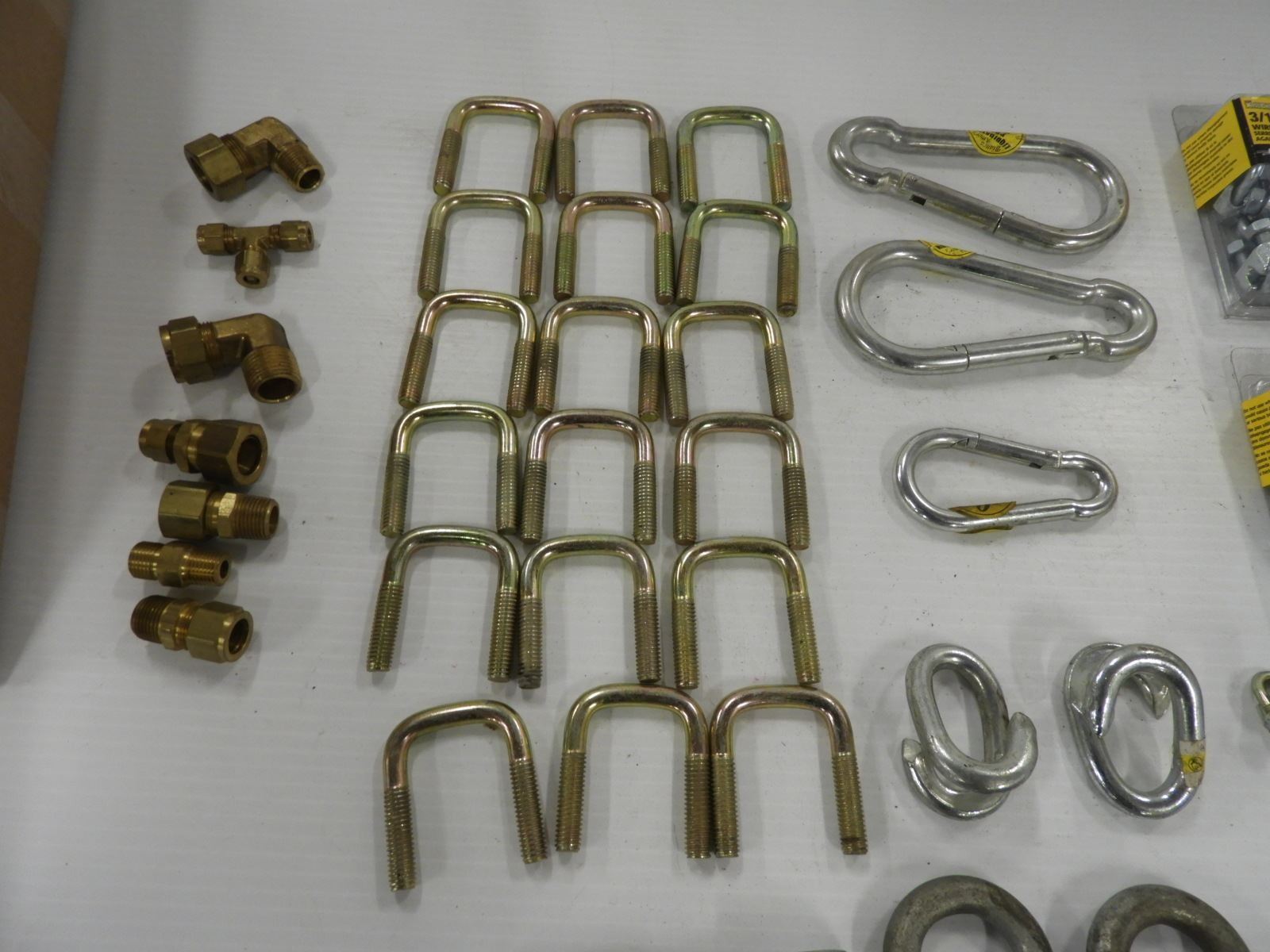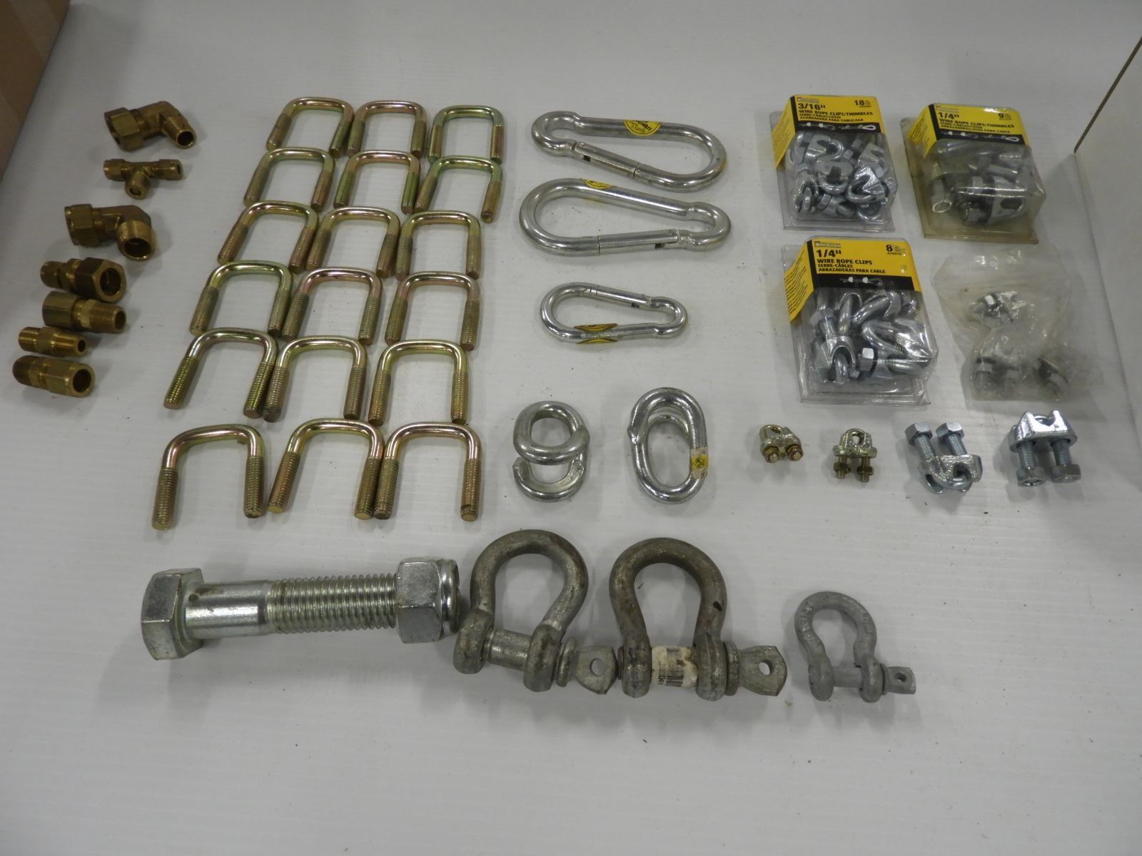 (18) square clamps 2" x 2-1/2" (unused), (3) carabiners (unused), (2) connector links (unused), cable clamps (unused), (3) clevis (unused), " bolt with lock nuts 1" x 4" (unused), (7) brass fittings (unused), assorted hydraulic bits (unused)