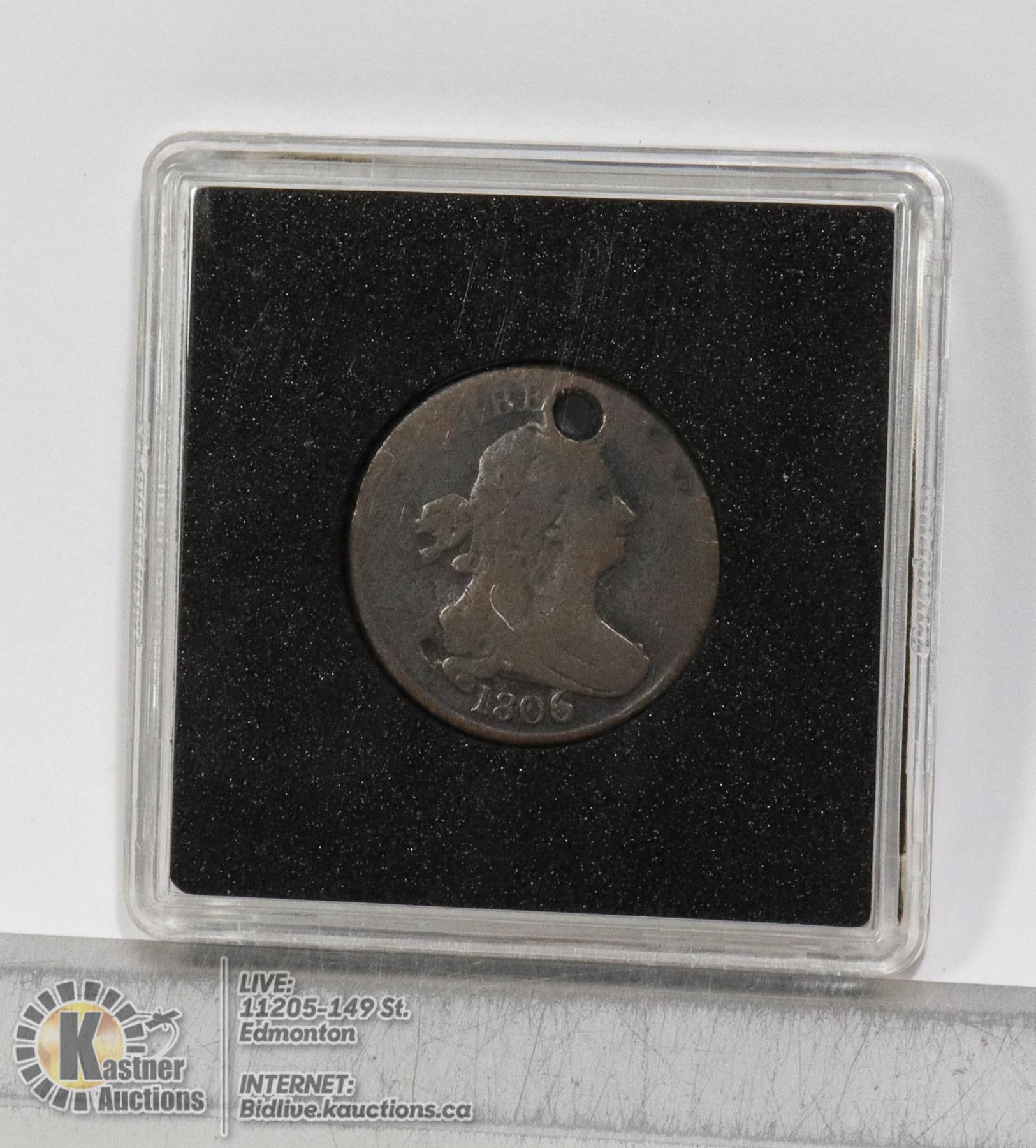 SCARCE LOW MINTAGE EARLY USA HALF PENNY COIN FROM 1806. ONLY 356K MINTED. THIS VERSION IS THE LARGE 6 VARIETY. HOLED. GOOD FOR DATE FILLER.