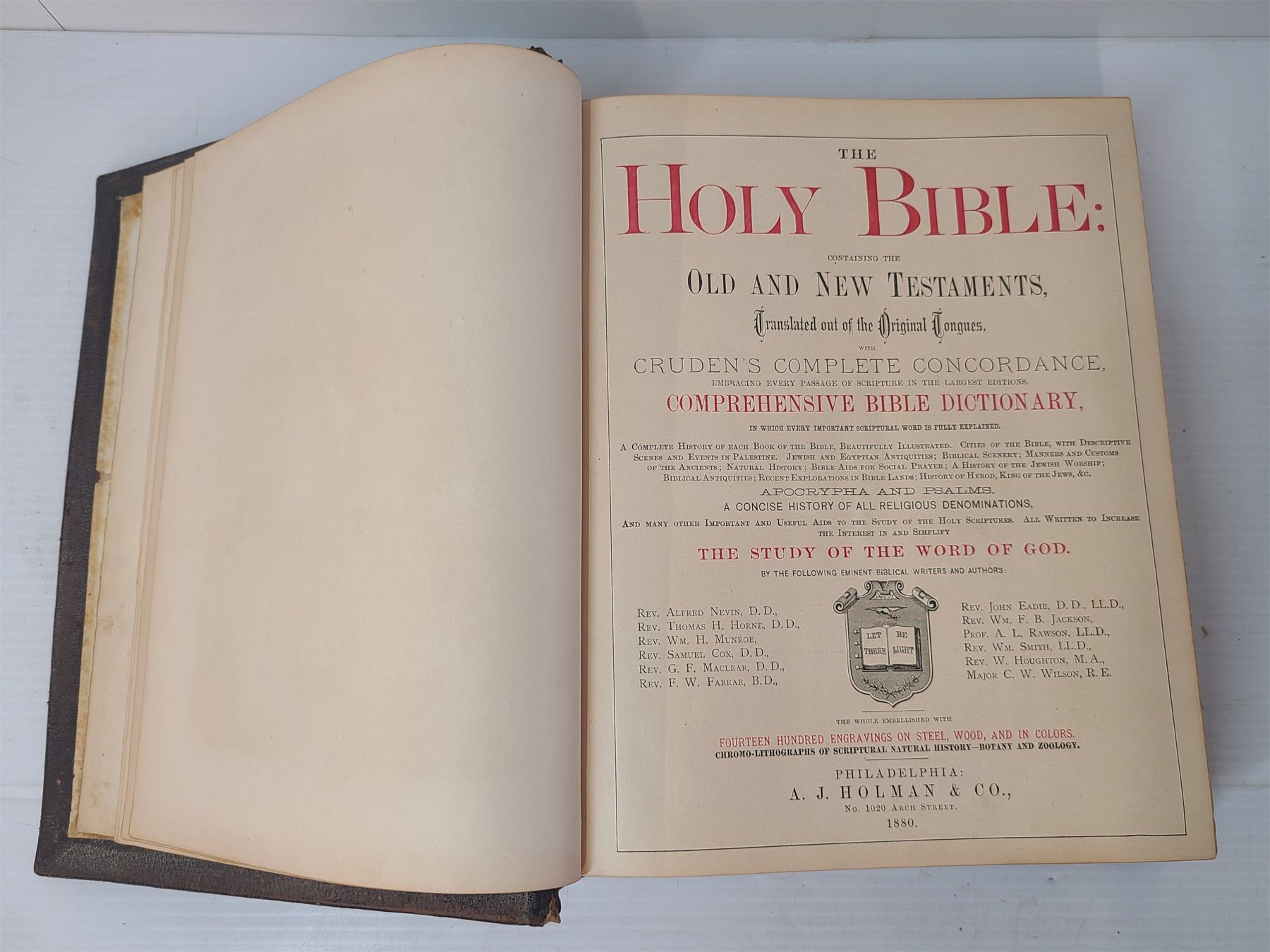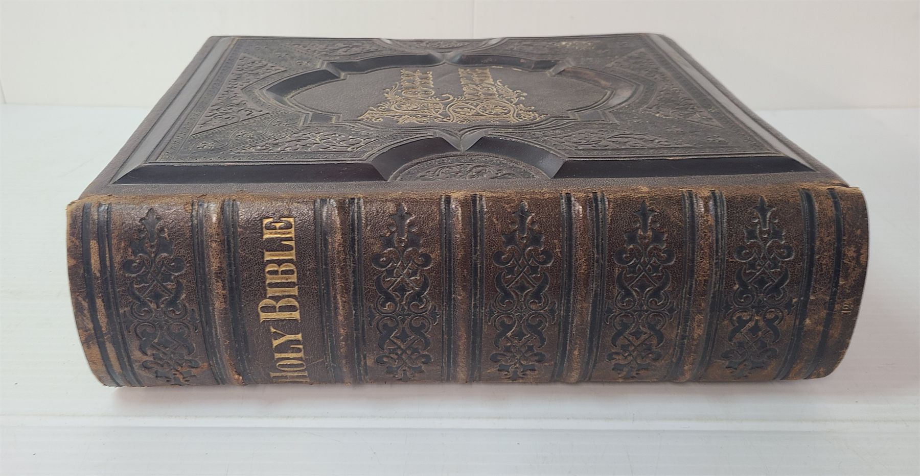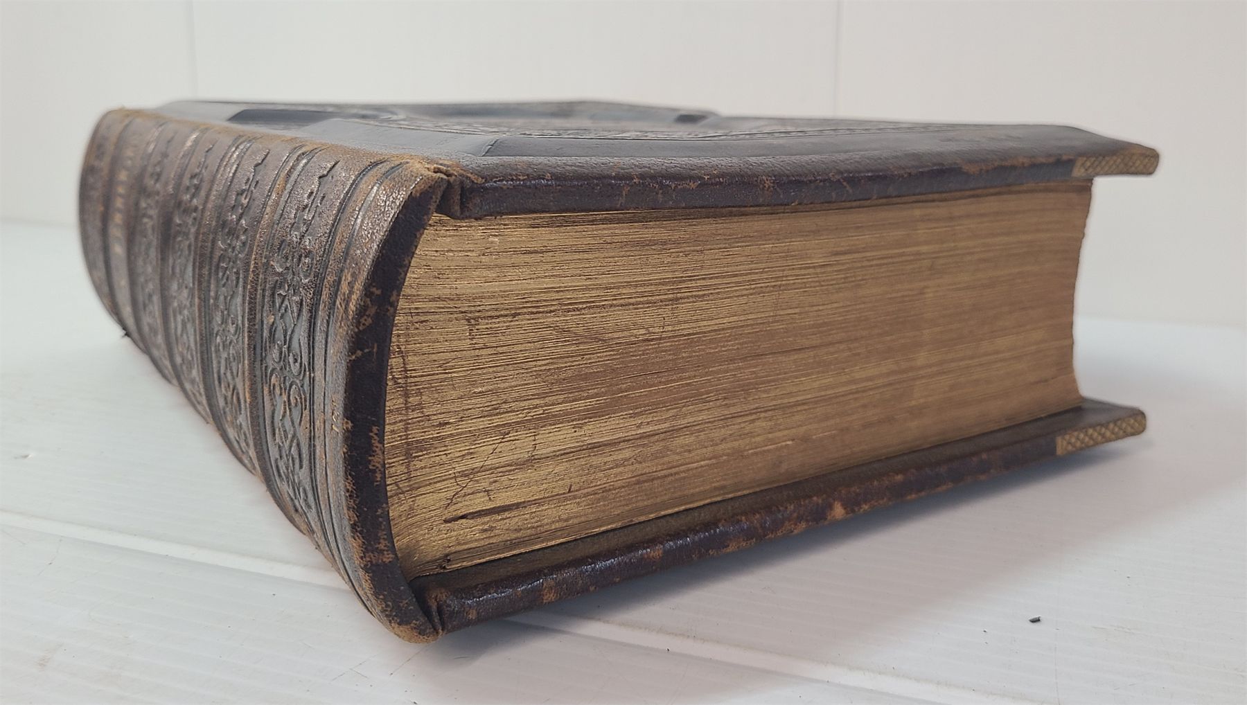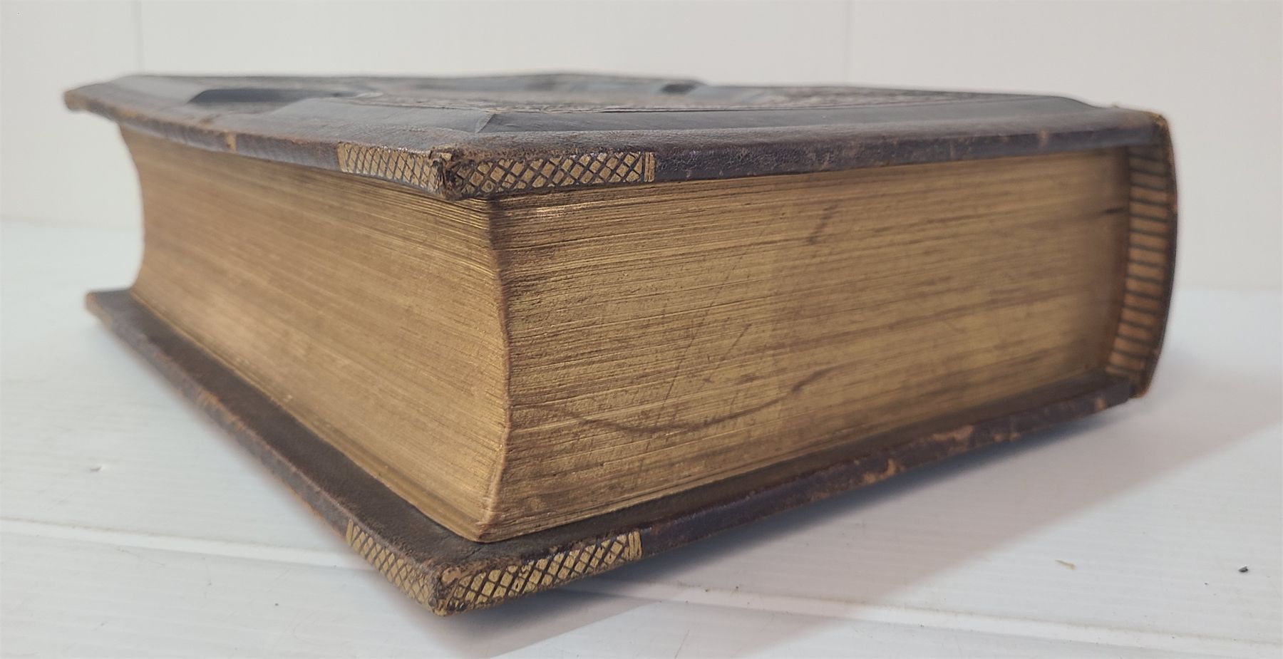 NOTE: OLD & NEW TESTAMENT W/ APOCRYPHA - LEATHER BOUND W/ HARDWARE - SHOWS FOXING & WEAR - GILDED PAGES