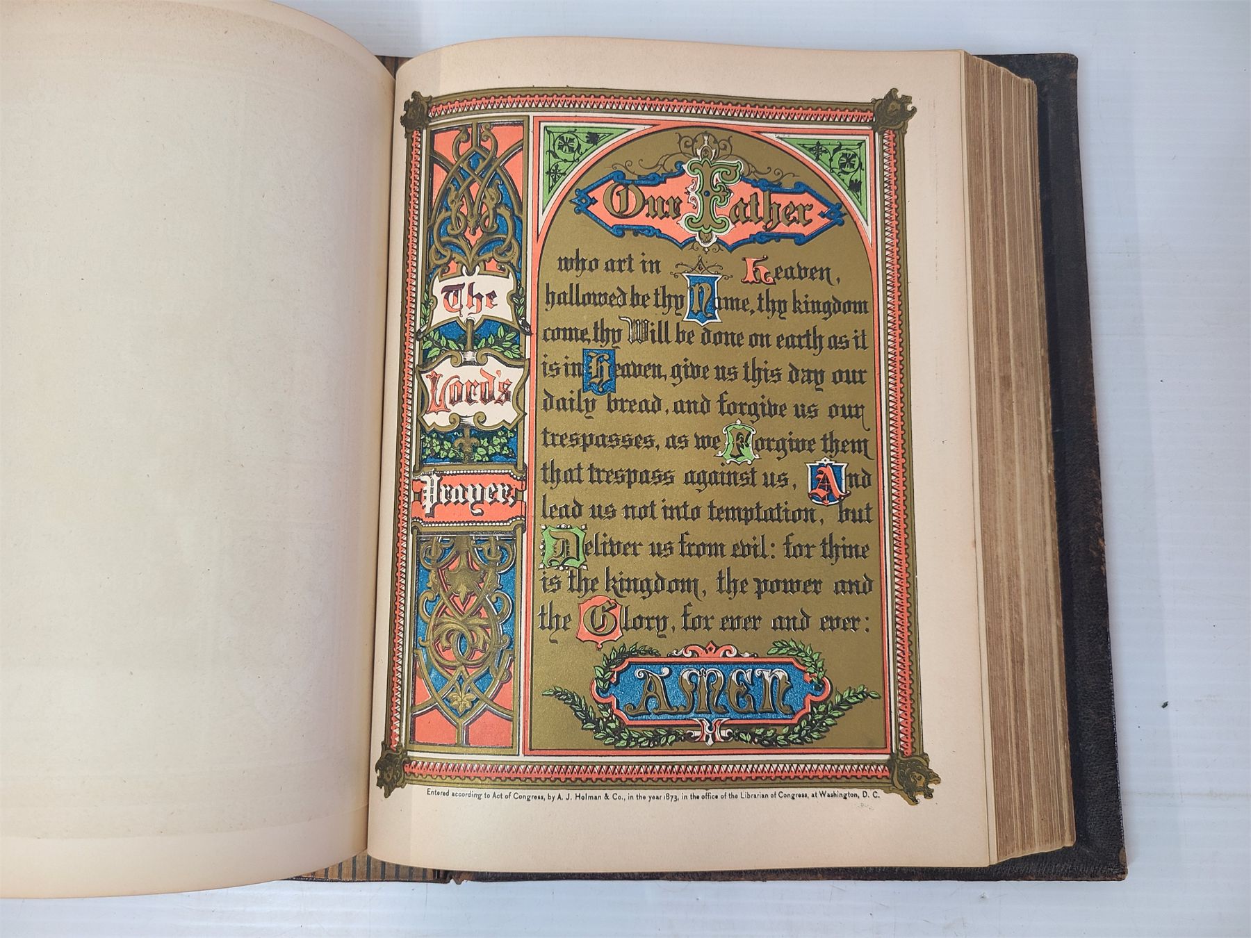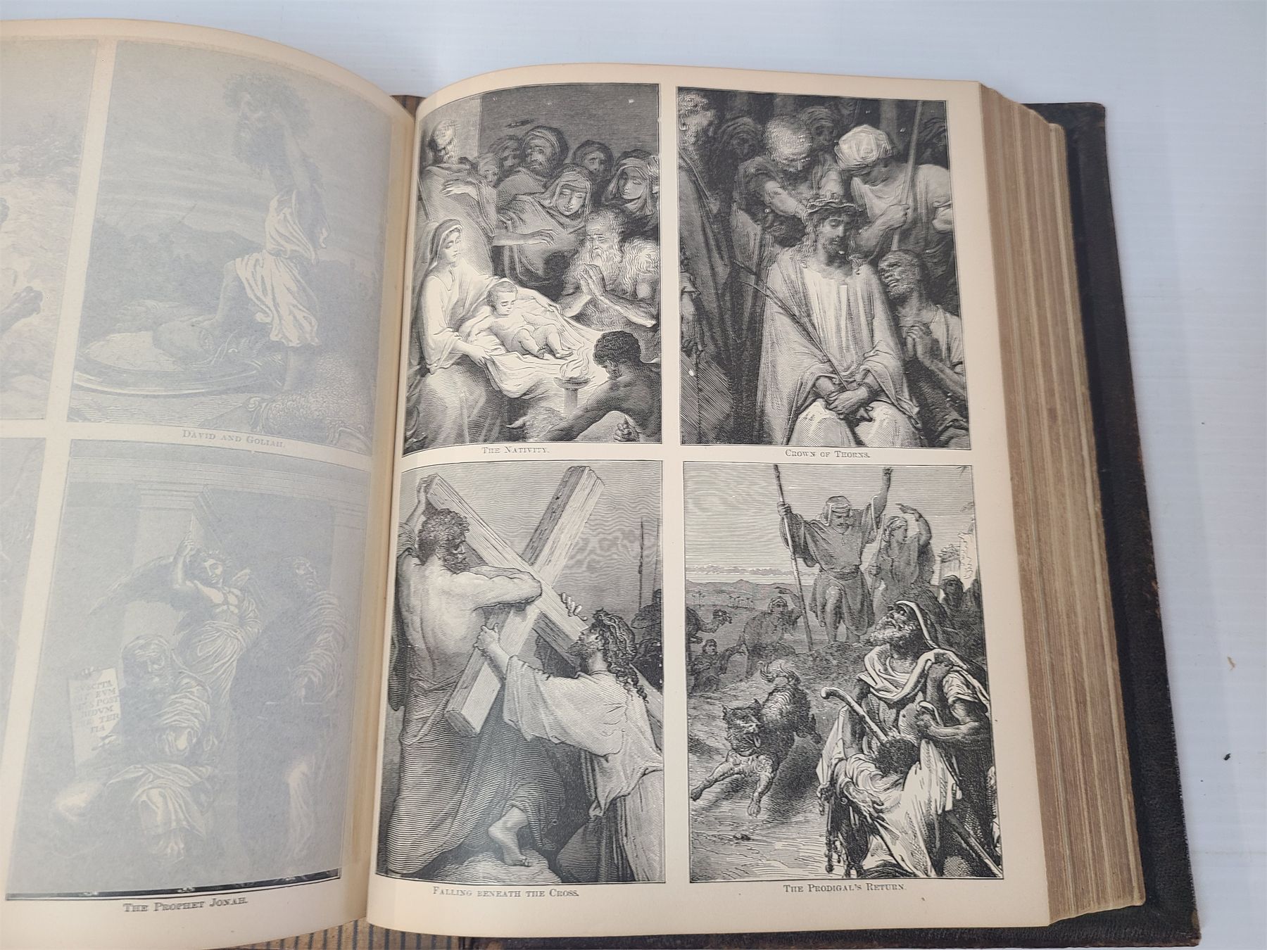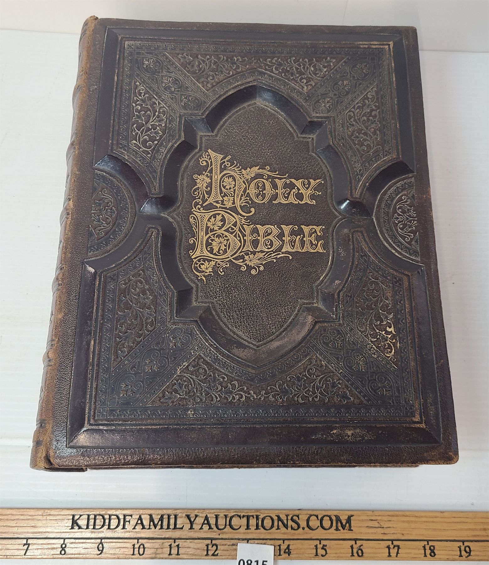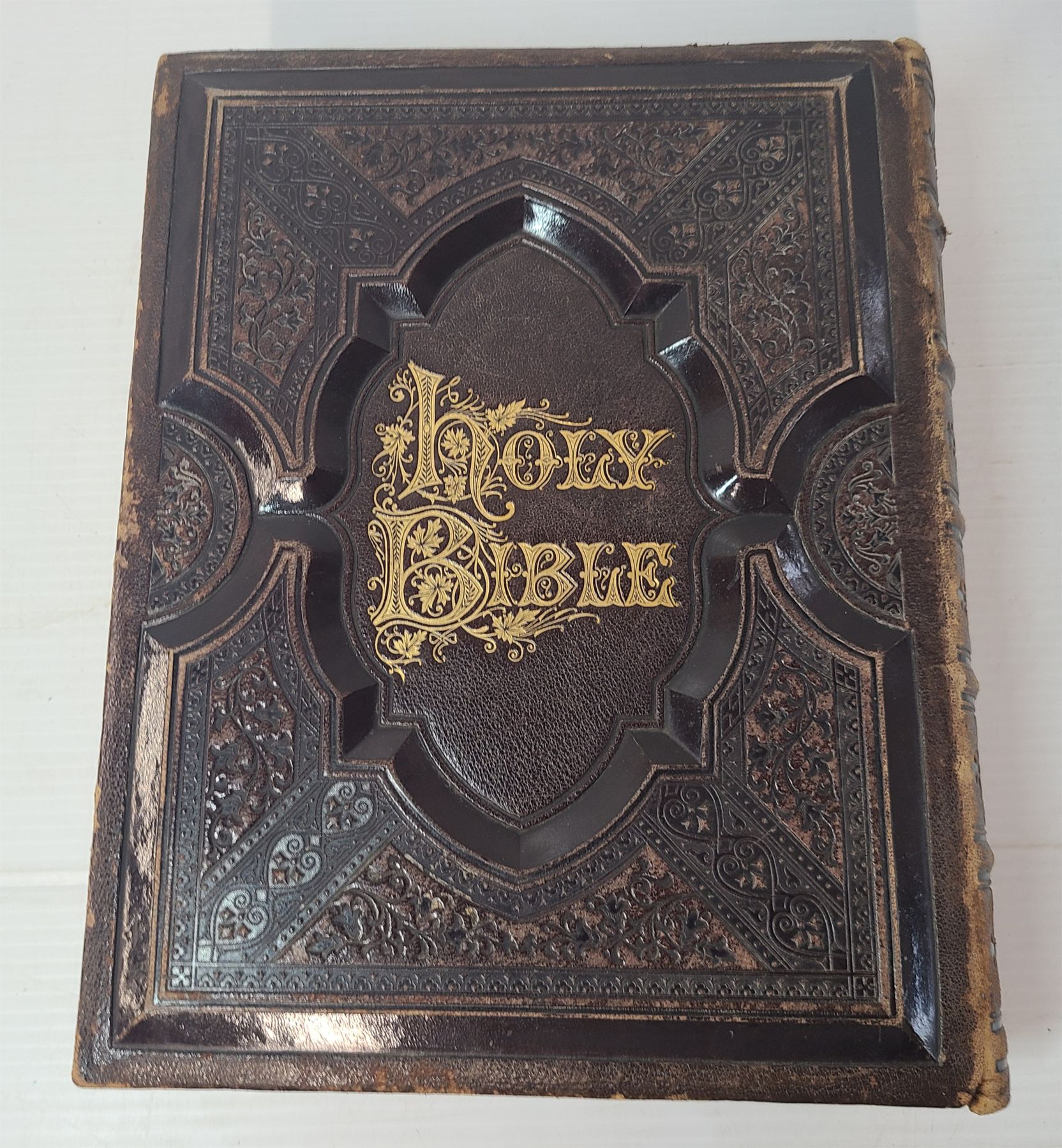 NOTE: OLD & NEW TESTAMENT W/ APOCRYPHA - LEATHER BOUND W/ HARDWARE - SHOWS FOXING & WEAR - GILDED PAGES