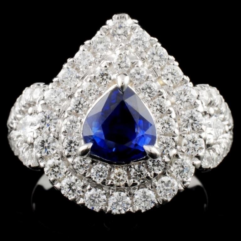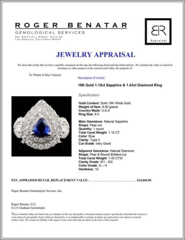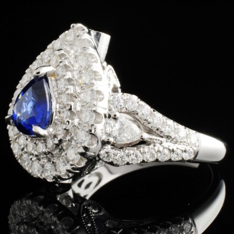 Estimated Retail Replacement Value: $24,060.00Ref: WAG9624Item no.: FA2054477004-BR6406AS1Specification:Gold Content: Solid 18K White Gold Weight of Item: 9.00 gramsCountry Made: U.S.ARing Size: 6.5 Main Gemstone: Natural Sapphire Shape: Pear-cut Quantity: 1 countTotal Carat Weight: 1.10 CTColor: BlueClarity: Type 2Cut Grade: Very GoodAdjacent Gemstone: Natural Diamond Shape: Pear & Round Brilliant-cutTotal Carat Weight: 1.43 CTWClarity Grade: SI1 - SI2Color Grade: G – H Hardness: 10 Great Condition - Shipping notes: We ship 4-10 Business day after the clearance of payment. Tracking numbers are emailed once the package(s) are shipped. Most shipments are sent by FEDEX Priority, UPS Priority, or US PRIORITY MAIL INSURED