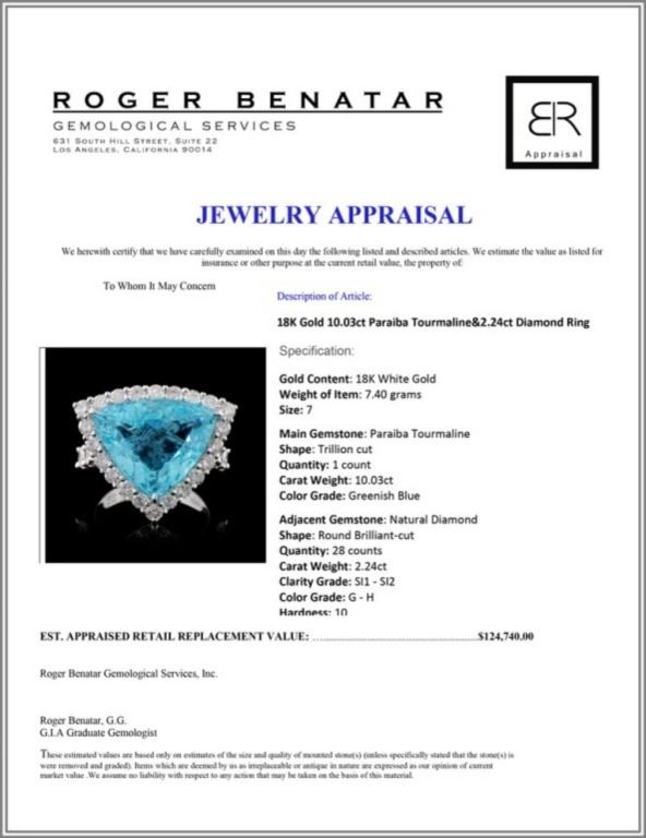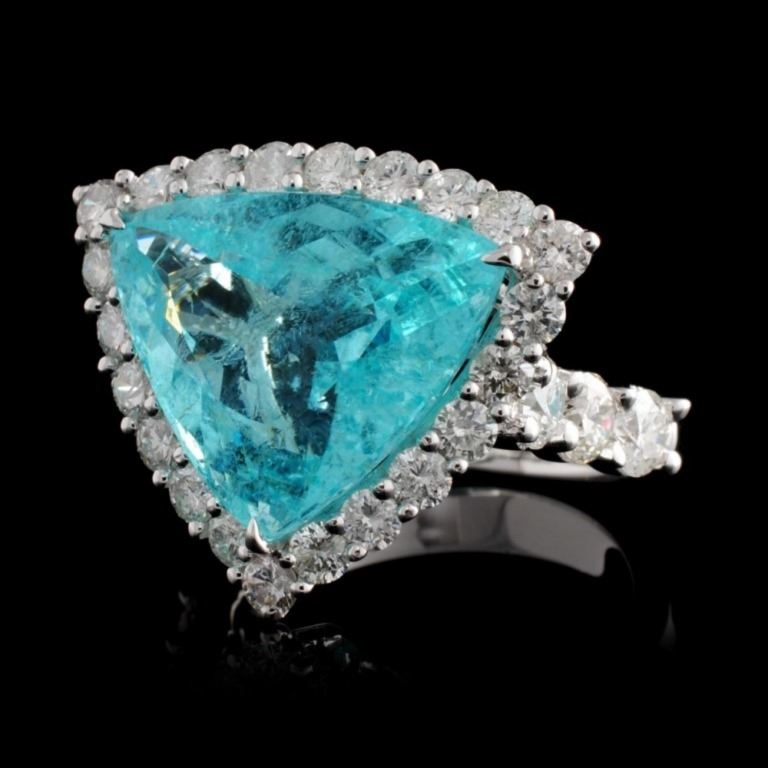 Estimated Retail Replacement Value: $124,740.00Ref: WAG49896Item no.: FA2053273015-BR6272ATORGold Content: 18K White GoldWeight of Item: 7.40 gramsSize: 7Main Gemstone: Paraiba TourmalineShape: Trillion cutQuantity: 1 countCarat Weight: 10.03ctColor Grade: Greenish BlueAdjacent Gemstone: Natural DiamondShape: Round Brilliant-cutQuantity: 28 countsCarat Weight: 2.24ctClarity Grade: SI1 - SI2Color Grade: G - HHardness: 10 Great Condition - Shipping notes: We ship 4-10 Business day after the clearance of payment. Tracking numbers are emailed once the package(s) are shipped. Most shipments are sent by FEDEX Priority, UPS Priority, or US PRIORITY MAIL INSURED