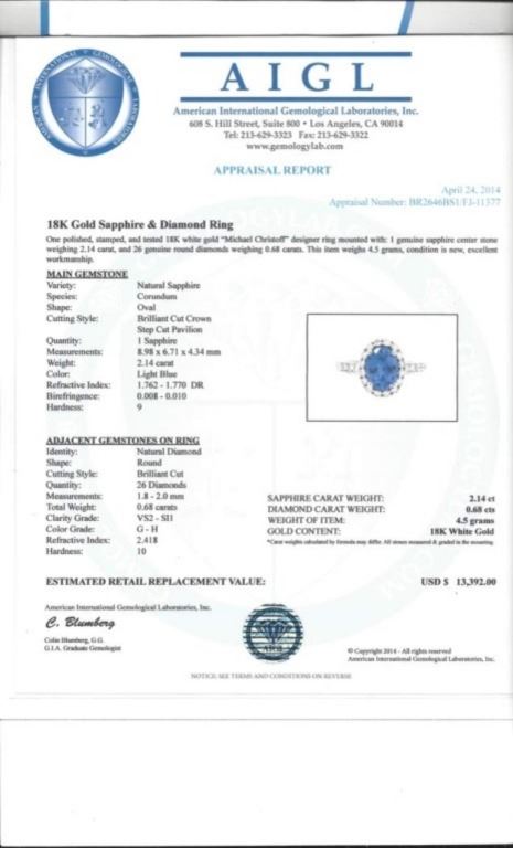 Regarding Appraised Jewelry and Loose Stones - Auctionfarm sends them out to a third party for Retail Replacement Value Appraisals, which are the most common. These types of evaluations are written for insurance needs. This would be the cost to replace the jewelry with an item of equal quality and kind, considered to be the current market price or the replacement value. This type of appraisal is done to protect you in the event of damage or loss of a valuable item. Our appraisals are conducted by independent 3rd Party appraisal firms that utilizes Certified GIA Gemologist. Appraisals should be used for verification of gemstone and/or metal weight, size, and grade only, not actual value. Appraisal value should be considered for insurance purposes only, not actual value, as price varies greatly from retail locations thru out the world. Items should not be purchased with the expectation to resell for appraisal price, or for profit.