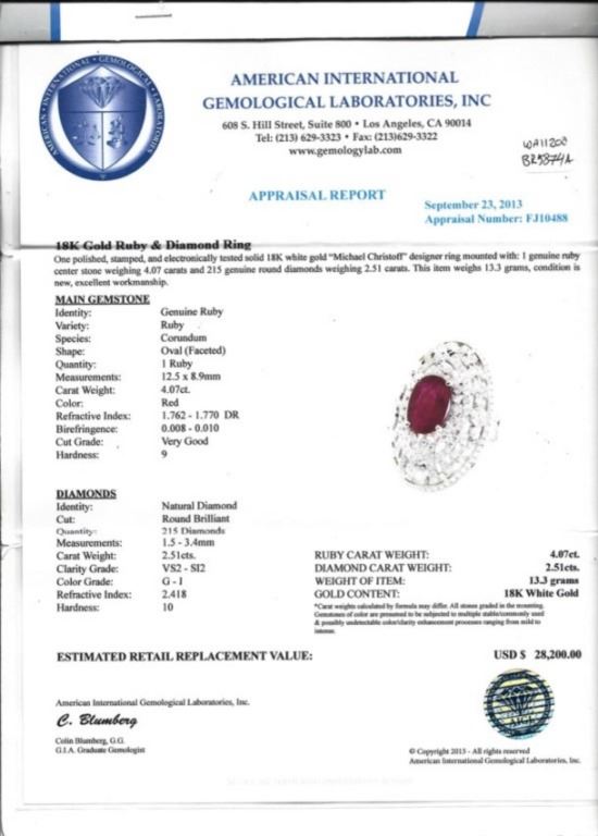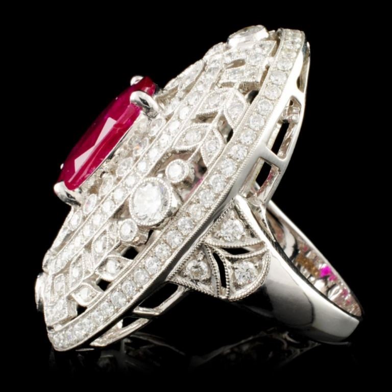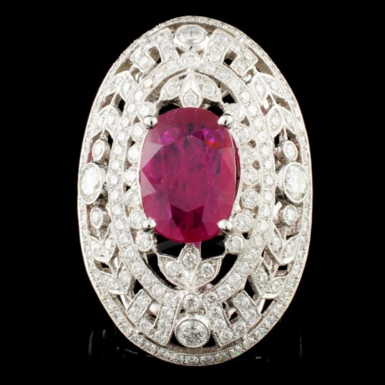 Estimated Retail Replacement Value: $28,200.00Ref: WAG11200Item no.: ARA7009Specification:Gold Content: Solid 18K White Gold Weight of Item: 13.30 gramsSize: 7.5Country Made: U.S.A Main Gemstone: Natural RubyShape: Oval-shapeQuantity: 1Total Carat Weight: 4.07ctColor: RedClarity: Type 2 Cut Grade: Very Good Adjacent Gemstone: Natural Diamond Shape: Round Brilliant-cut Quantity: 215 countsTotal Carat Weight: 2.51ctwClarity Grade: VS2 – SI2Color Grade: G - I Hardness: 10 Great Condition - Shipping notes: We ship 4-10 Business day after the clearance of payment. Tracking numbers are emailed once the package(s) are shipped. Most shipments are sent by FEDEX Priority, UPS Priority, or US PRIORITY MAIL INSURED