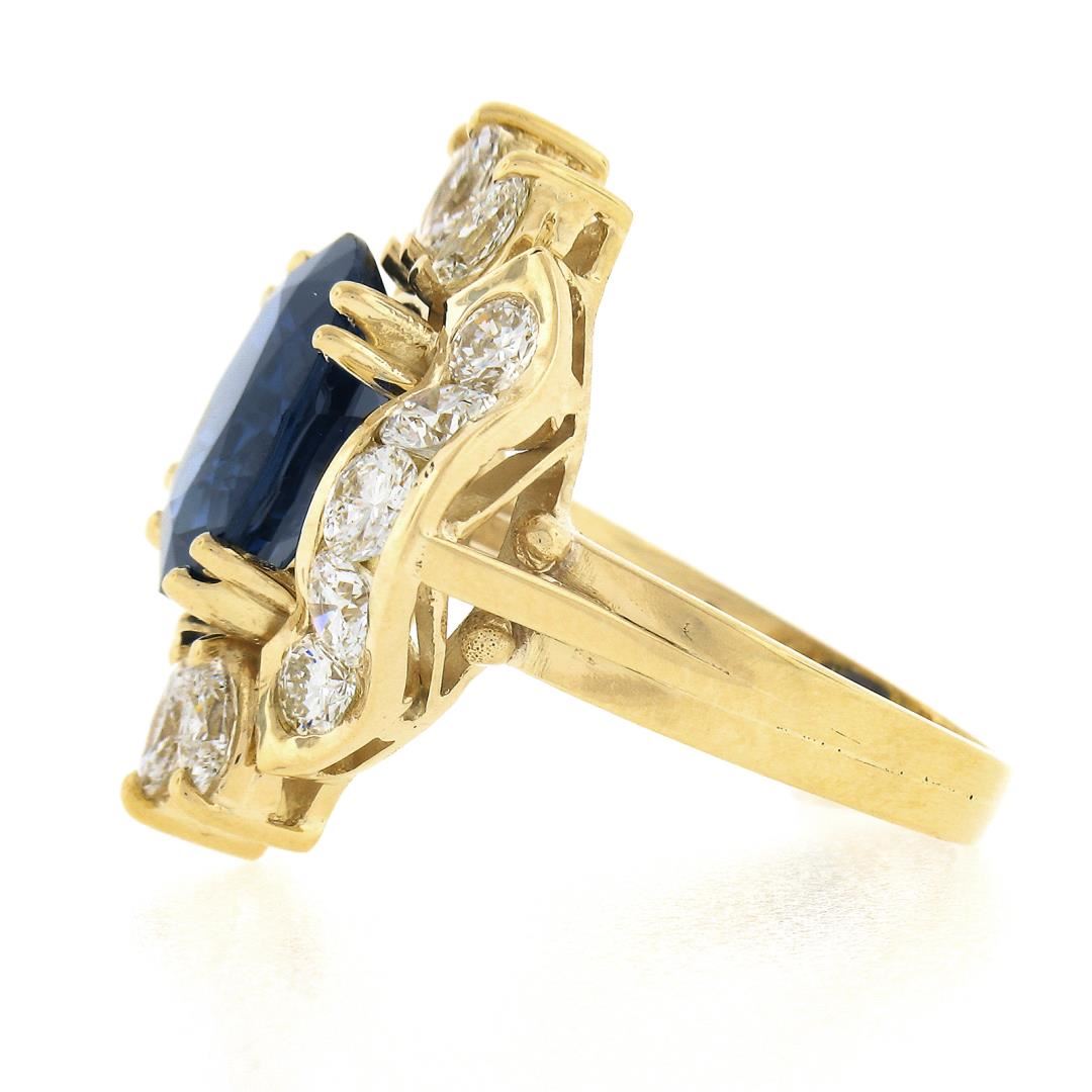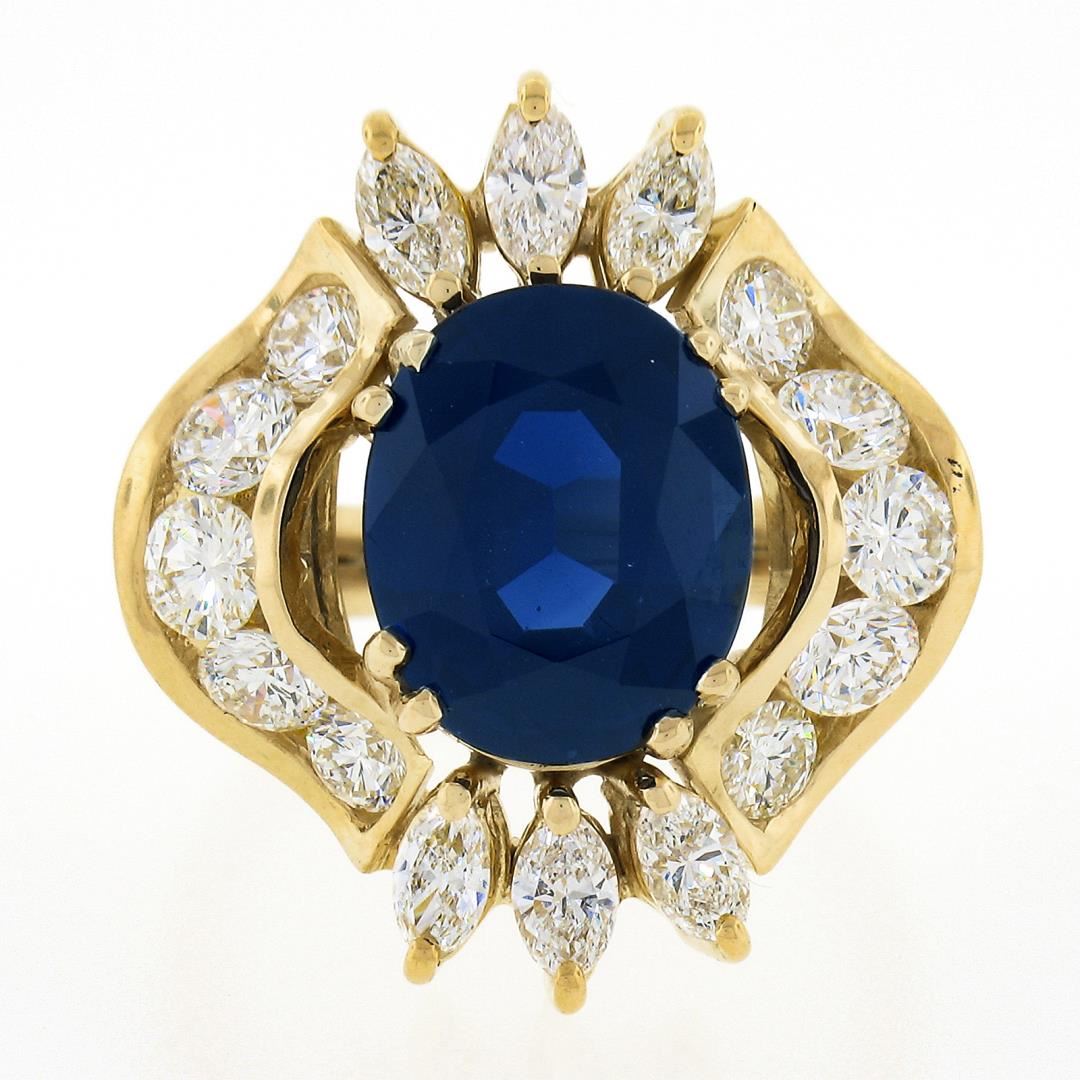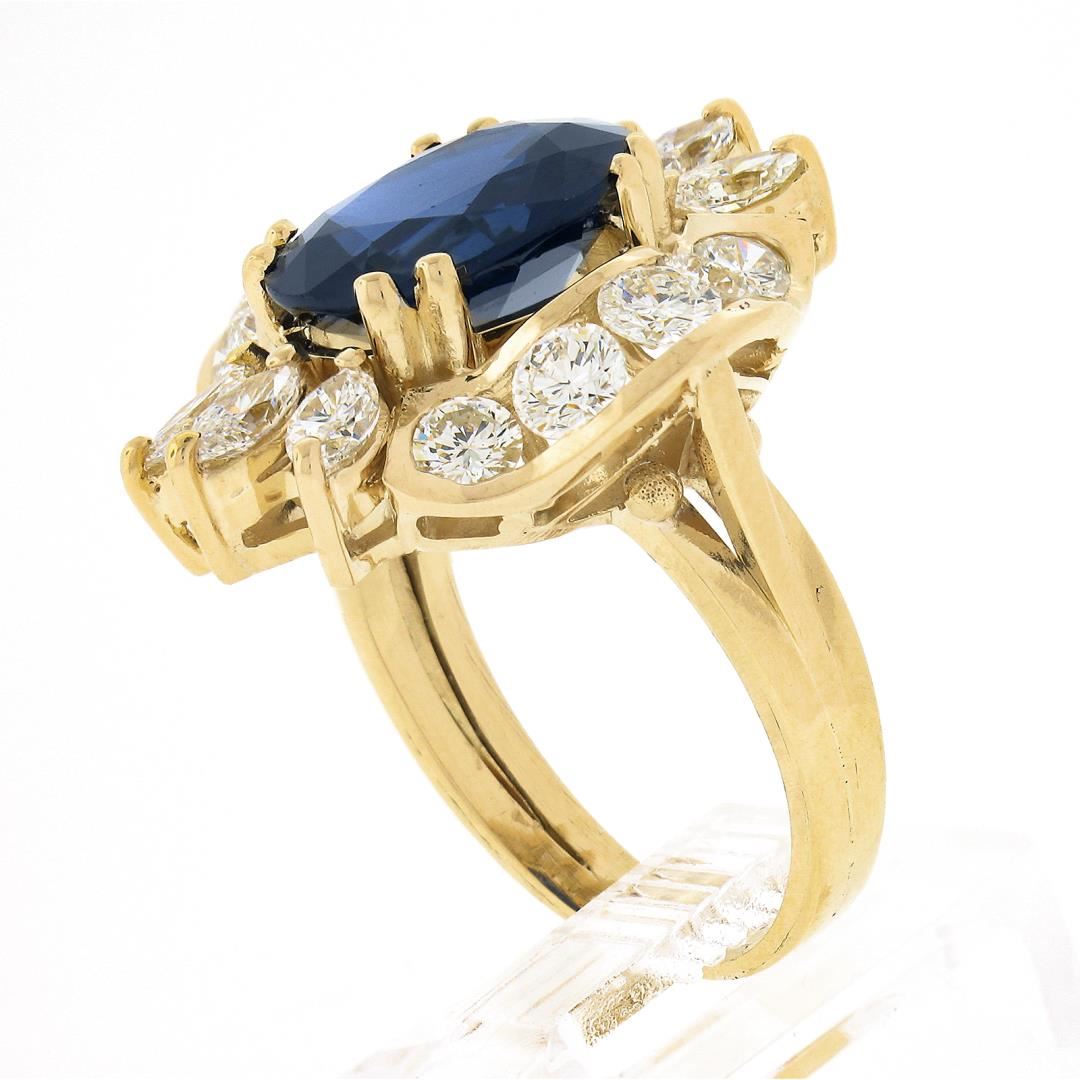 A solid 18k yellow gold ring, with 1 GIA graded oval cut natural sapphire (5.50ct ), and 10 round brilliant cut natural diamonds (F/G - VVS2/VS1 ; 1.50ctw (), with 6 marquise cut natural diamonds (G/H - VS1/VS2 ; 0.72ctw). The ring is size 7.5, weighs a total of 9.78 grams, and measures 23.7mm wide. Comes with all original relevant certifications.