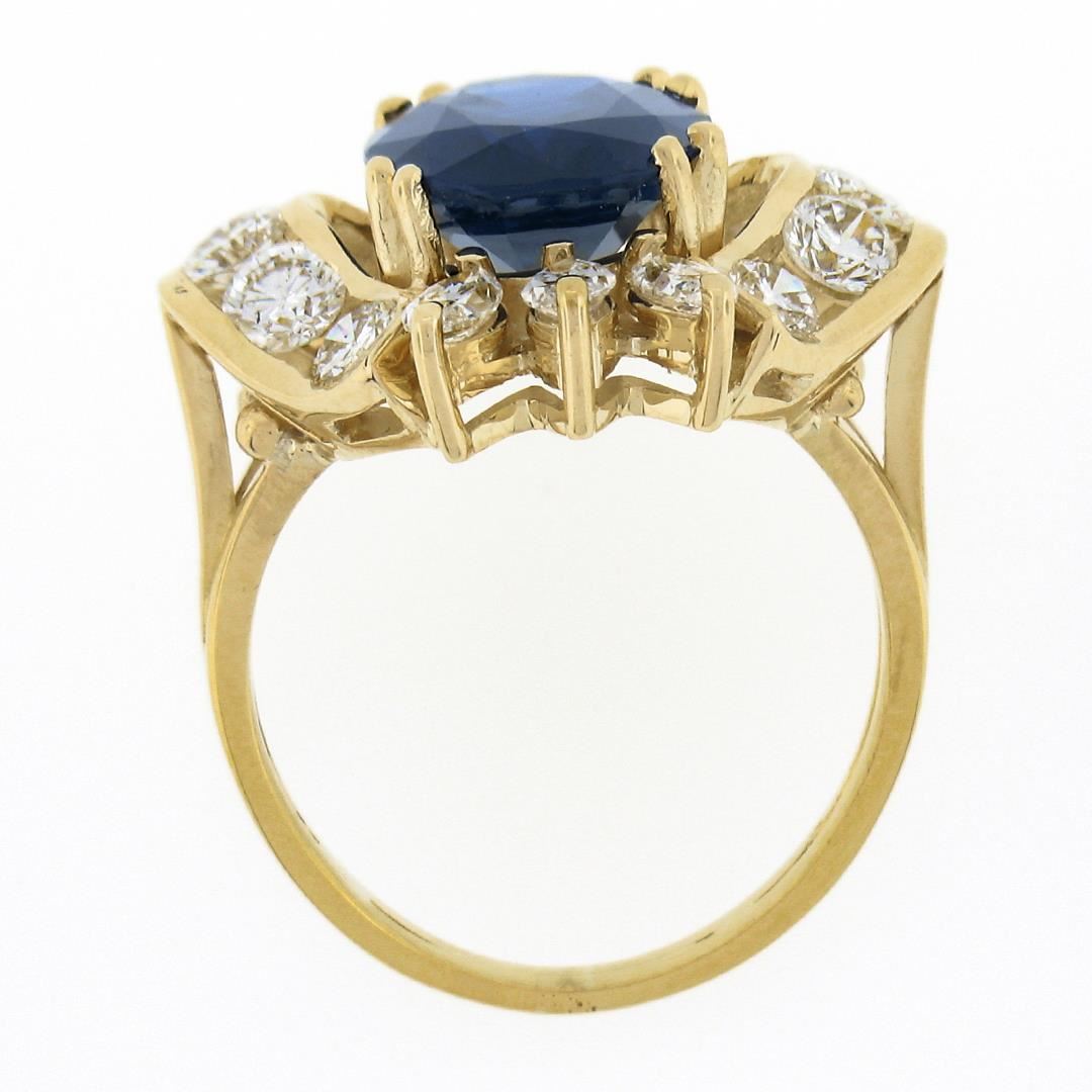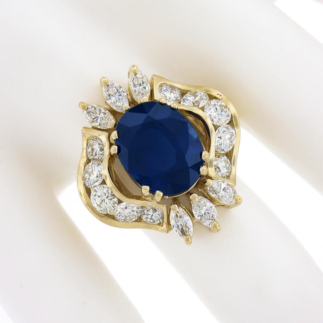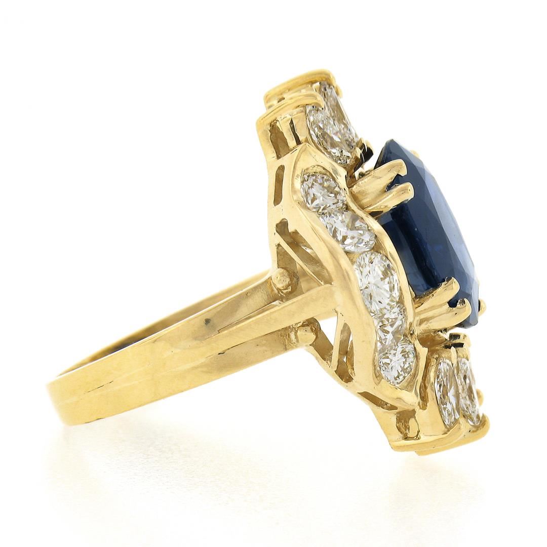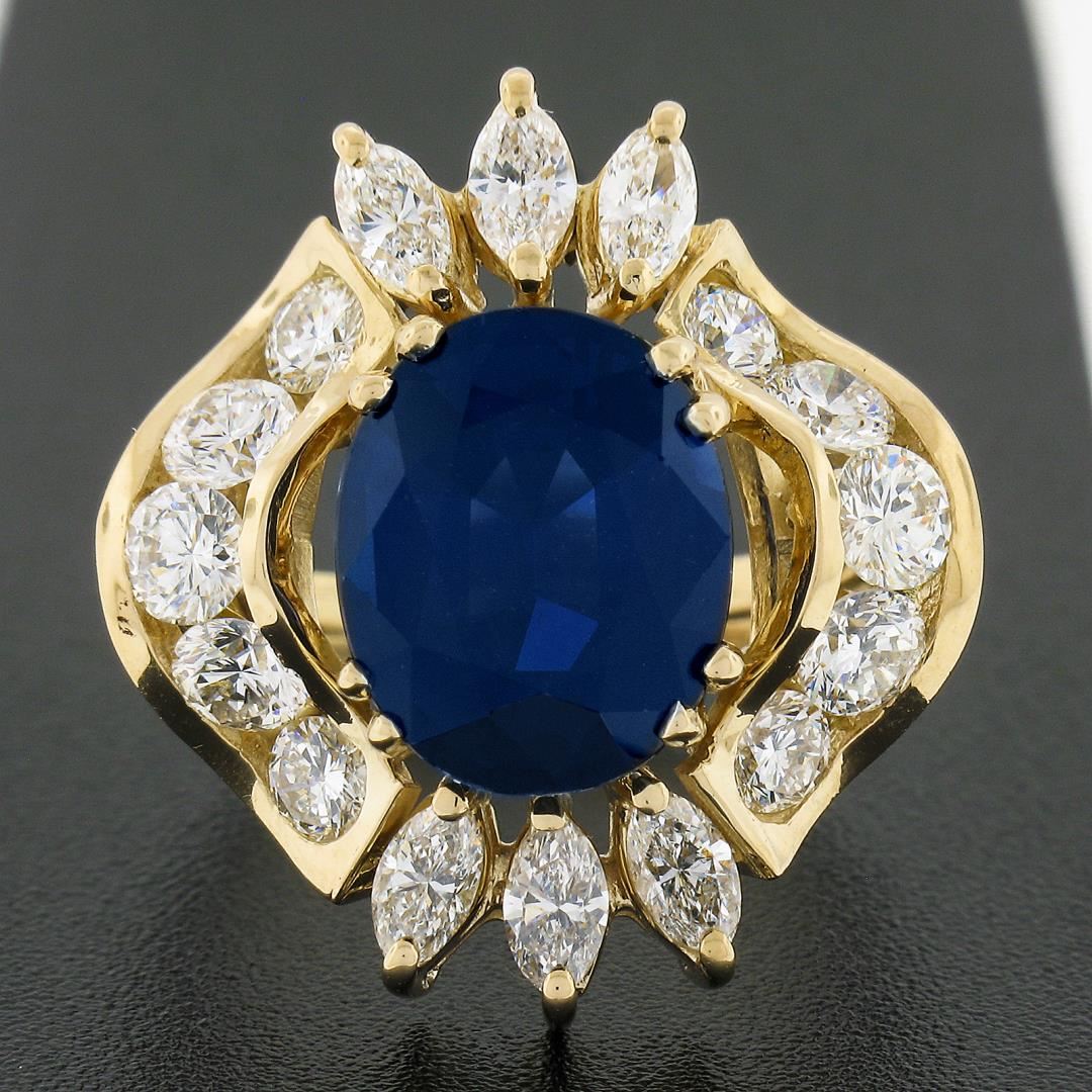 A solid 18k yellow gold ring, with 1 GIA graded oval cut natural sapphire (5.50ct ), and 10 round brilliant cut natural diamonds (F/G - VVS2/VS1 ; 1.50ctw (), with 6 marquise cut natural diamonds (G/H - VS1/VS2 ; 0.72ctw). The ring is size 7.5, weighs a total of 9.78 grams, and measures 23.7mm wide. Comes with all original relevant certifications.
