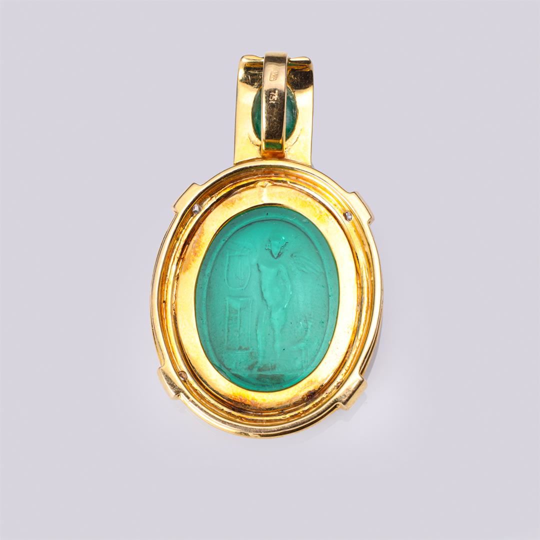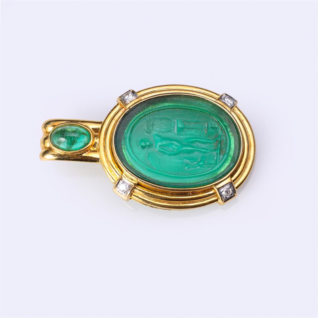 18K Gold, Emerald & Diamond Pendant with Antique Venetian Glass Cameo Medallion