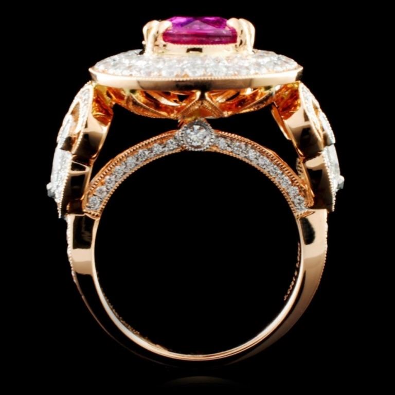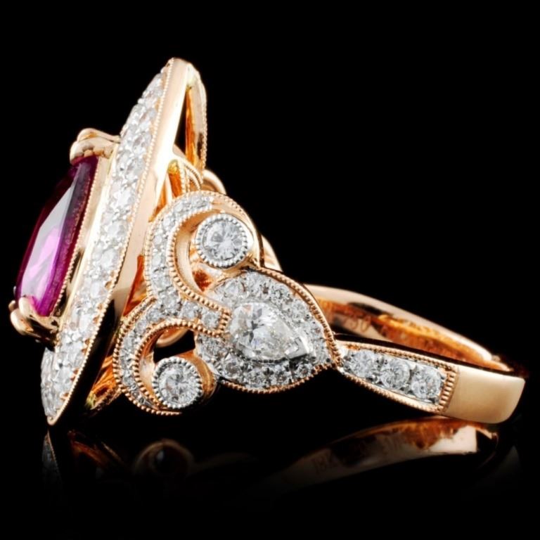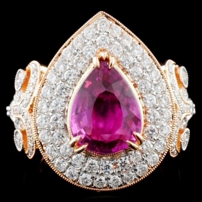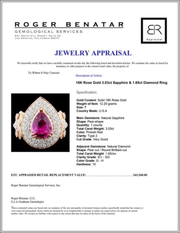 Estimated Retail Replacement Value: $43,560.00Ref: WAG17424Item no.: FA2054477006-BR6407APSSpecification:Gold Content: Solid 18K Rose Gold Weight of Item: 12.20 gramsSize: 7Country Made: U.S.A Main Gemstone: Natural SapphireShape: Pear-shapeQuantity: 1 countsTotal Carat Weight: 3.03ctColor: Pinkish RedClarity: Type 2Cut Grade: Very GoodAdjacent Gemstone: Natural Diamond Shape: Pear cut / Round Brilliant-cutTotal Carat Weight: 1.65ctwClarity Grade: SI1 - SI2Color Grade: G - HHardness: 10 Great Condition - Shipping notes: We ship 4-10 Business day after the clearance of payment. Tracking numbers are emailed once the package(s) are shipped. Most shipments are sent by FEDEX Priority, UPS Priority, or US PRIORITY MAIL INSURED