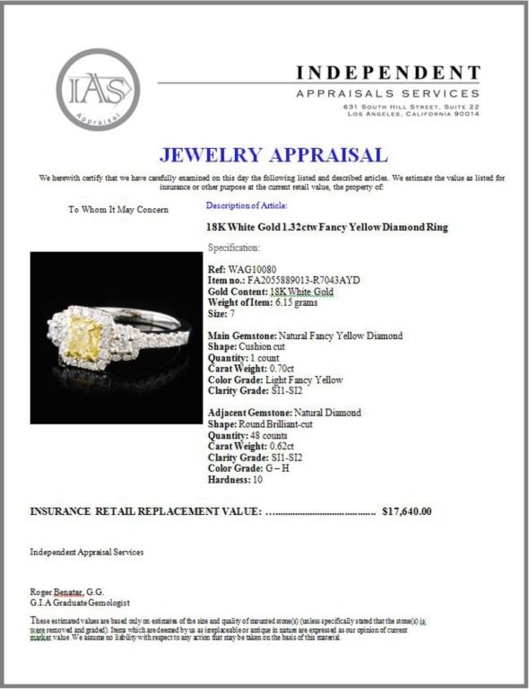 Regarding Appraised Jewelry and Loose Stones - Auctionfarm sends them out to a third party for Retail Replacement Value Appraisals, which are the most common. These types of evaluations are written for insurance needs. This would be the cost to replace the jewelry with an item of equal quality and kind, considered to be the current market price or the replacement value. This type of appraisal is done to protect you in the event of damage or loss of a valuable item. Our appraisals are conducted by independent 3rd Party appraisal firms that utilizes Certified GIA Gemologist. Appraisals should be used for verification of gemstone and/or metal weight, size, and grade only, not actual value. Appraisal value should be considered for insurance purposes only, not actual value, as price varies greatly from retail locations thru out the world. Items should not be purchased with the expectation to resell for appraisal price, or for profit.