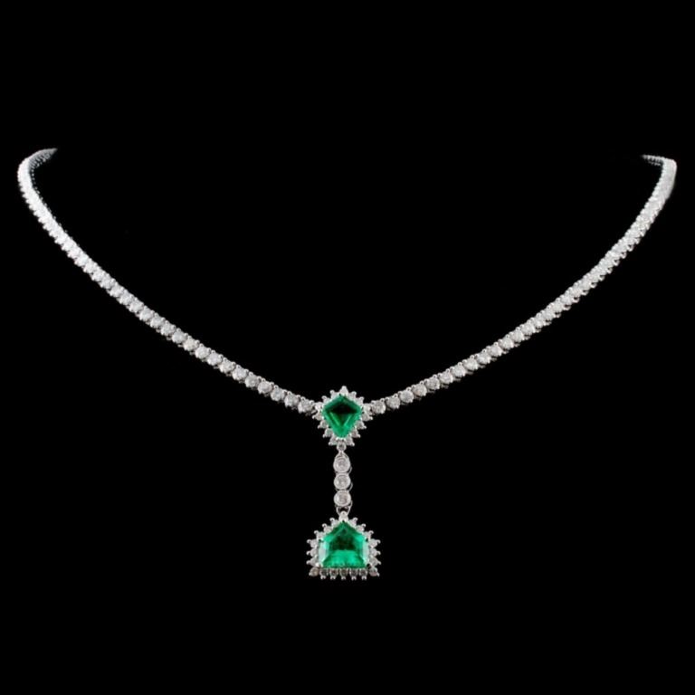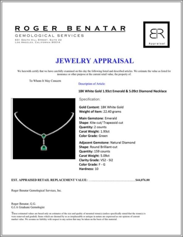 Estimated Retail Replacement Value: $44,076.00Ref: WAG17632Item no.: FA2053273001-N2057AE2Gold Content: 18K White GoldWeight of Item: 22.40 gramsMain Gemstone: Natural EmeraldShape: Kite cut/ Trapezoid cutQuantity: 2 countsCarat Weight: 1.93ctColor Grade: GreenAdjacent Gemstone: Natural DiamondShape: Round Brilliant-cutQuantity: 159 countsCarat Weight: 5.09ctClarity Grade: VS2 - SI2Color Grade: F - GHardness: 10 Great Condition - Shipping notes: We ship 4-10 Business day after the clearance of payment. Tracking numbers are emailed once the package(s) are shipped. Most shipments are sent by FEDEX Priority, UPS Priority, or US PRIORITY MAIL INSURED