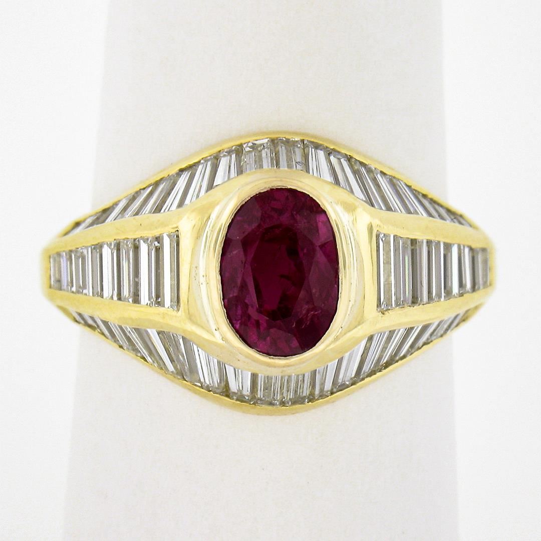 A solid 18k yellow gold ring, featuring 1 GIA graded oval cut natural ruby (1.85ct), and 56 caliber baguette & square step cut natural diamonds (H-J - VS1/VS2 ; 2.0ctw). and The ring is size 7.0, weighs a total of 6.24 grams, and measures 13mm wide. Comes with all original relevant certifications.