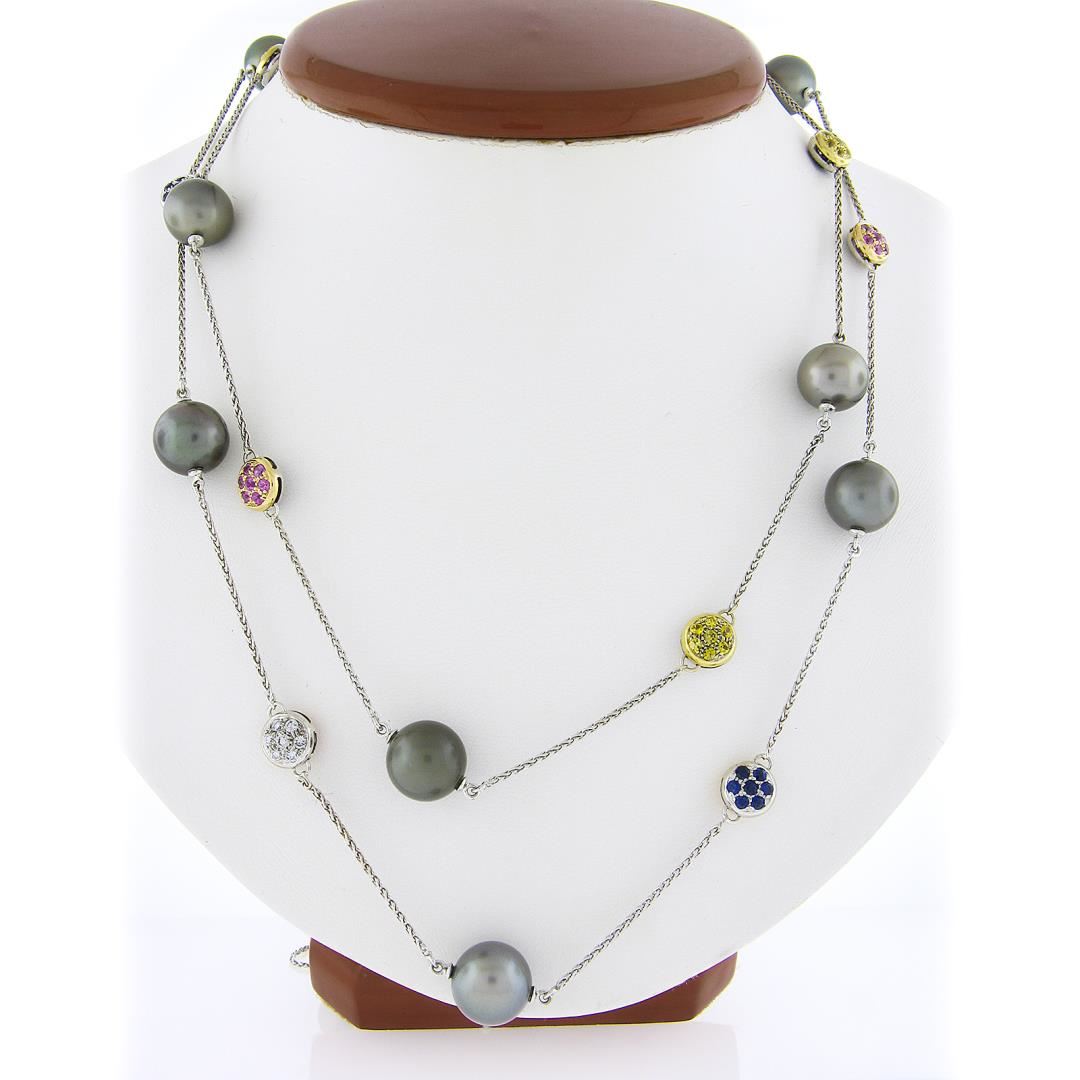 A solid 18k white & yellow gold station necklace, featuring 13 round shape gray cultured tahitian pearls (10.9-11.5mm), Numerous of round cut natural yellow, pink & blue sapphires (6ctw), and numerous of round cut natural diamonds (G/H - VS2-I1 ; 1.20ctw). It weighs a total of 54.11 grams, measures 11.5mm wide, and measures 46 inches in length.