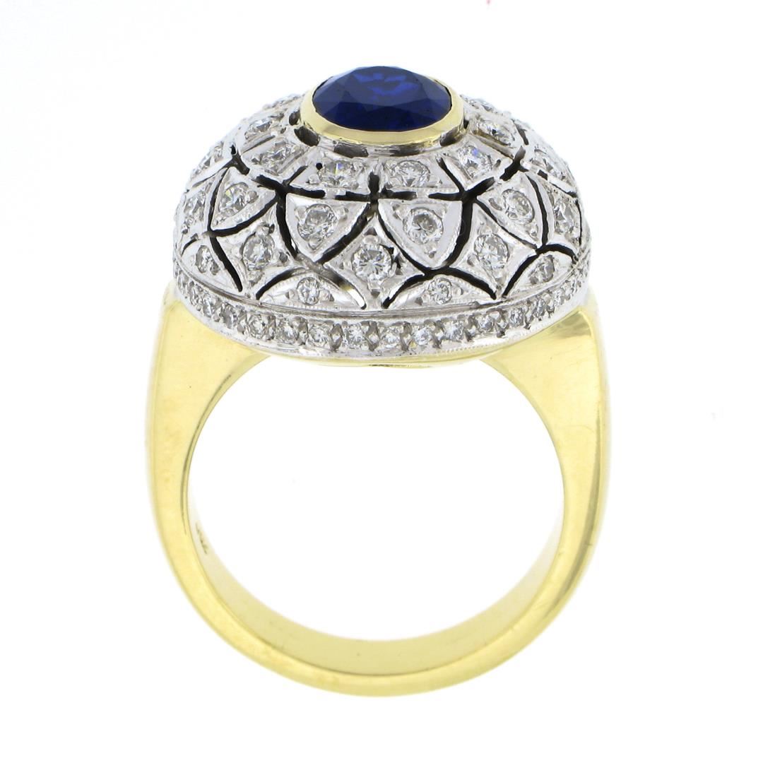 A solid 18k two tone cocktail ring, with 1 oval cut natural sapphire (7.9x6.3mm), and 86 round brilliant cut natural diamonds (F/G - VS1/VS2 ; 1.70ctw). The ring is size 6.5, weighs a total of 16.11 grams, and measures 20.70mm wide.