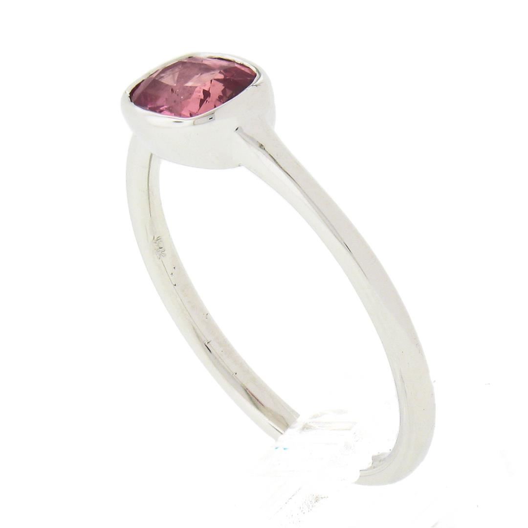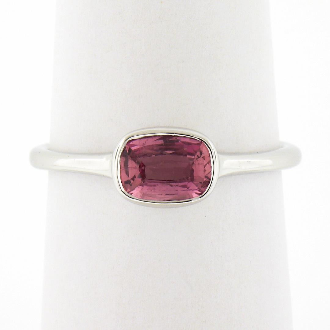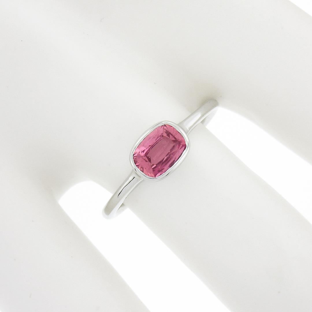A new solid 18k white gold solitaire ring, with 1 GIA graded cushion cut natural sapphire (0.81ct). The ring is size 6.5, weighs a total of 2.37 grams, and measures 5.7mm wide. Comes with all original relevant certifications.