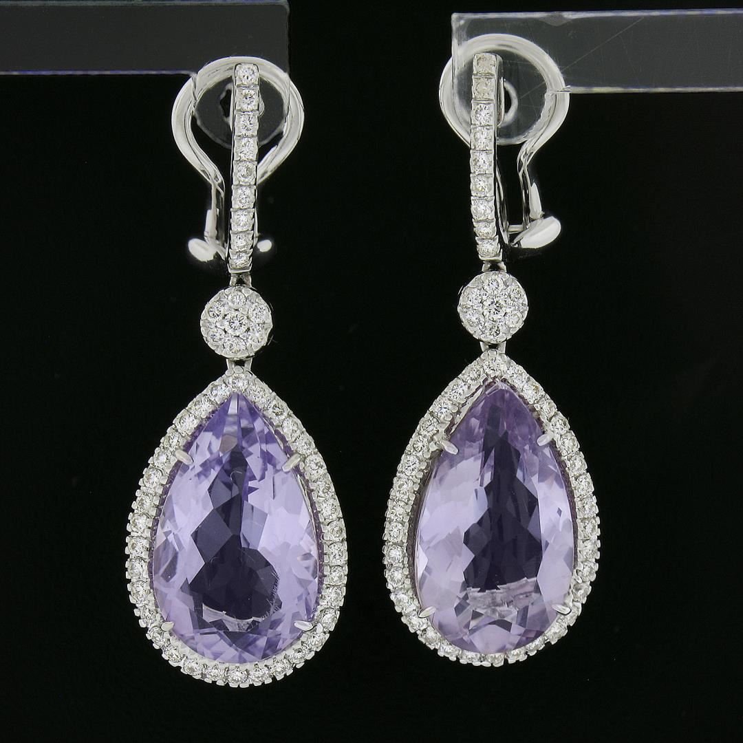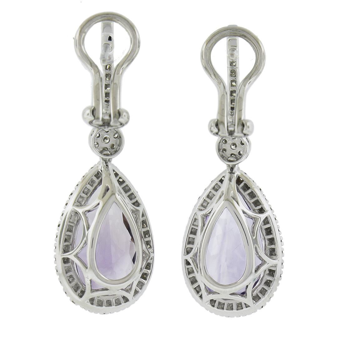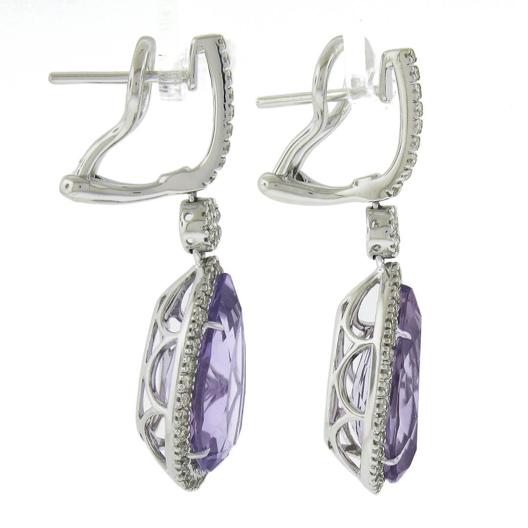 A solid 18k white gold drop dangle earrings, with 2 pear cut natural amethyst (12ctw), and 100 round cut natrual diamonds (G-I - VS1/VS2 ; 0.50ctw). The earrings measure approximately 35.2x12.9mm and weigh a total of 9.59 grams.