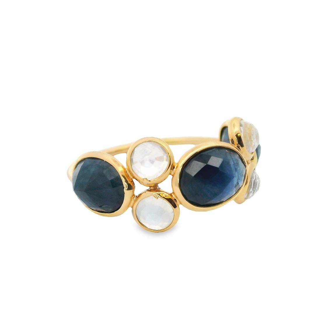 This striking 18kt yellow gold designer ring blends rich color contrasts with elegant craftsmanship. Featuring three bezel-set oval modified brilliant-cut natural blue sapphires, totaling 2.20ct, these gemstones exhibit a dark, moderately strong blue hue with a very good cut. Complementing them are four bezel-set round modified brilliant-cut natural moonstones, totaling 1.00ct, with a medium light, bluish-green glow and eye-clean clarity. The hand-assembled construction, bright polish finish, and slim 1.10mm shank enhance the ring's sophisticated aesthetic, making it a distinctive addition to any collection.