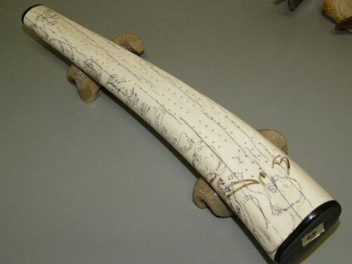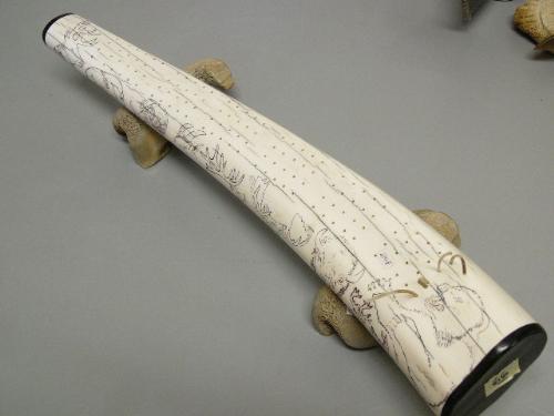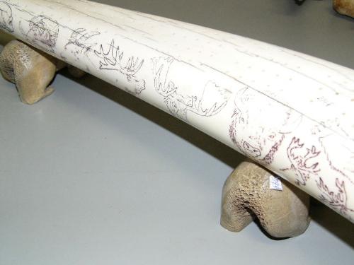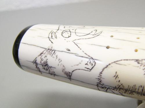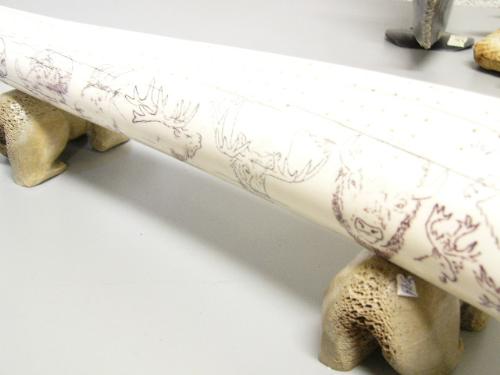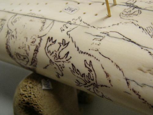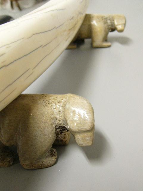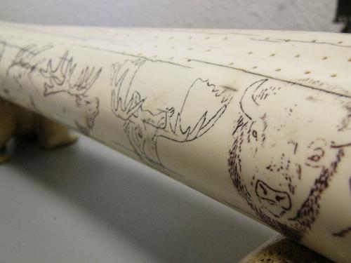 19" scrimshawed ivory crib board mounted on whale bone bears has baleen seal whisker cribbage pegs, scrimshawed with bear, 2 caribous, buffalo, moose, elf, goat, sheep, musk ox, deer; stock #314f (2)