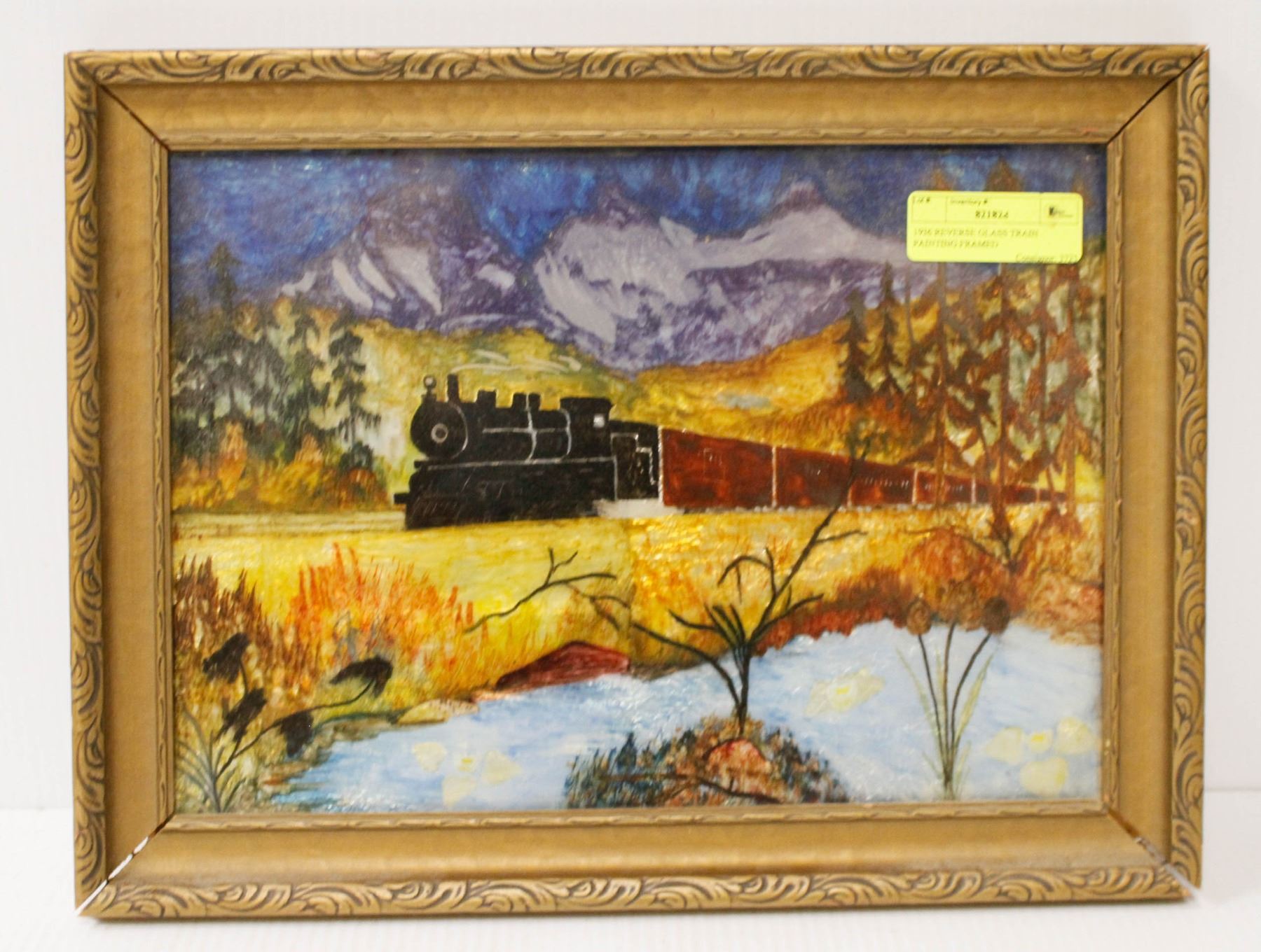 1936 REVERSE GLASS TRAIN PAINTING FRAMED. 17 X 30