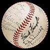 Reach OAL Harridge baseball signed in blue and black ink by 21 members of the 1944 Pittsburgh Pirates. Signatures include HOFers Frankie Frisch (manager) and Al Lopez, Frankie Gustine (sweet spot), Vince DiMaggio, Bob Elliott, Tommy O'Brien, Lloyd Waner, Rip Sewell, Fritz Ostermueller, Frank Colman, Spud Davis, Hank Camelli, Xavier Rescigno, Nick Strincevich, Joe Vitelli, Jim Russell, Cookie Cuccurullo, Max Butcher, Frankie Zak, Preacher Roe and one other. Ball is evenly toned with signatures that average a grade of 7 to 8, with the Frisch signature exhibiting some rubbing. Accompanied by a LOA from JSA.