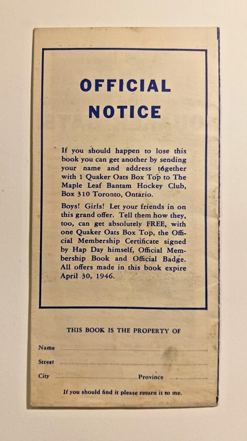 1945 Quaker Oats Toronto Maple Leaf Hockey Booklet