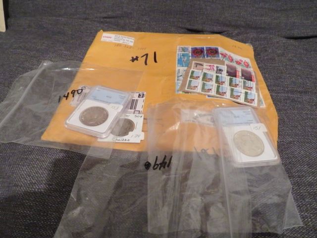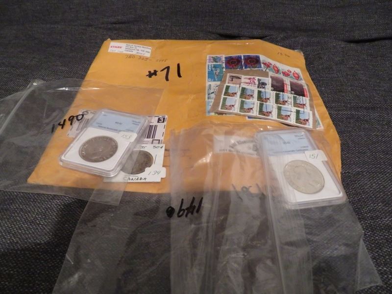 1951 & 1957 canada silver dollar and 1950 silver 50 cents and few stamps