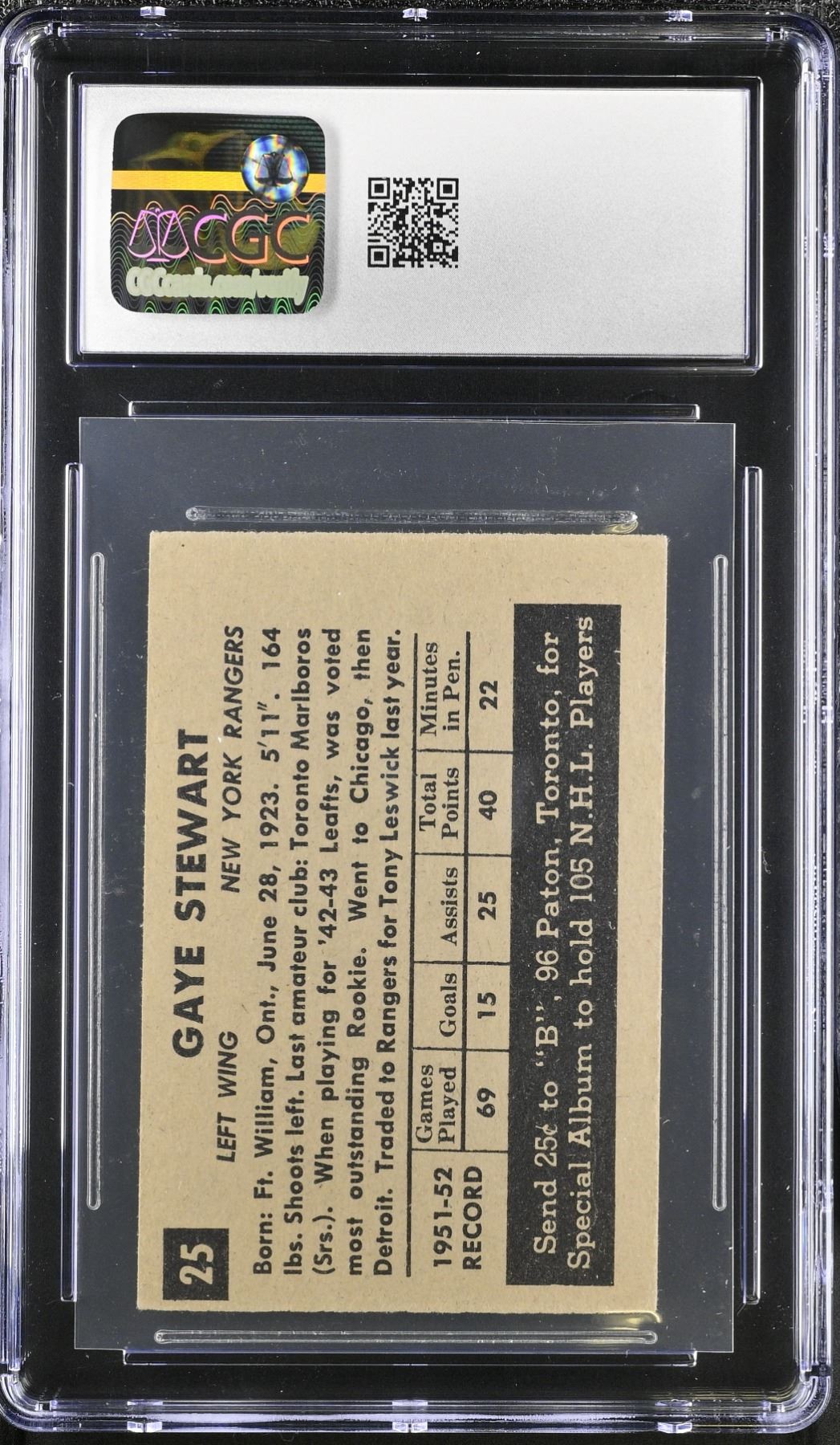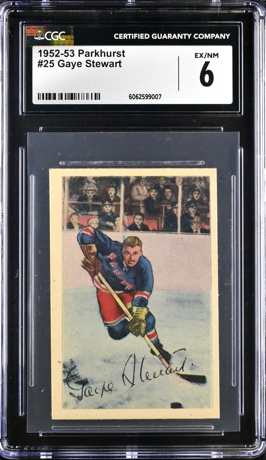 Stewart broke in with a bang in 1942 picking up 47 points in 48 games to win the Calder as Rookie of the Year. After two years serving in the Royal Canadian Navy in World War II, he came back the NHL and led the league in goals scored while finishing as runner-up for the league MVP. Although he never replicated this early success, he was a productive NHLer for nine seasons, winning a pair of Stanley Cups with Toronto. This, his second card, is graded a clean 6 EX-NM by CGC.