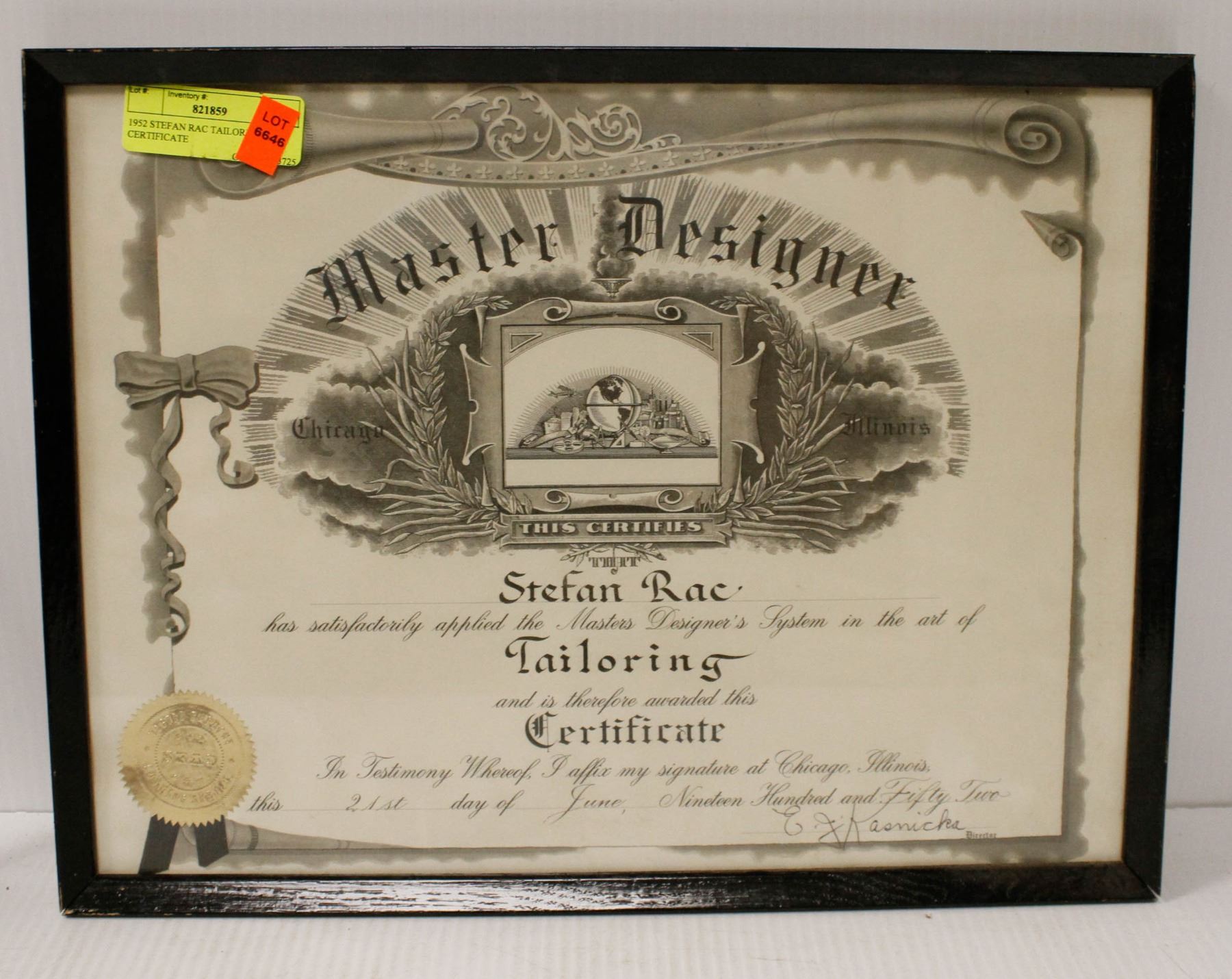 1952 STEFAN RAC TAILORING CERTIFICATE. 17 X 13