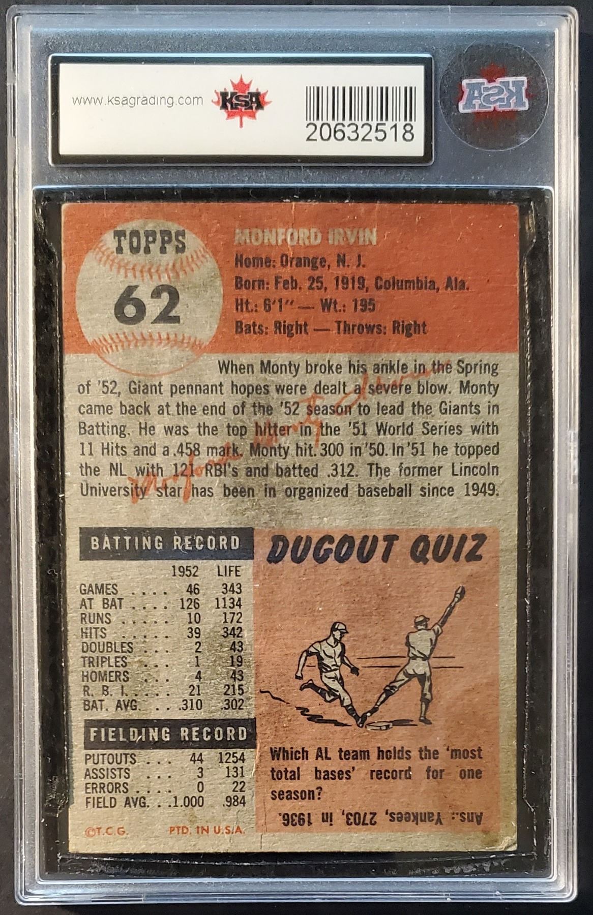 Graded 'Authentic' by KSA (due to stain removal on the back), front presents GD to VG.