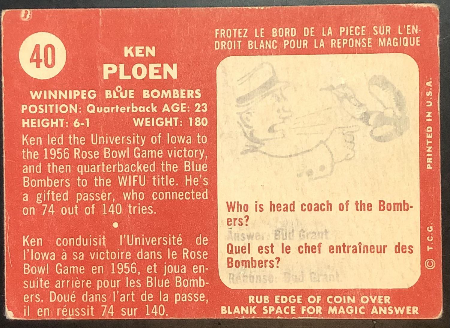 Card #40 vintage, CFL, football, OPC, hall of fame, rookie