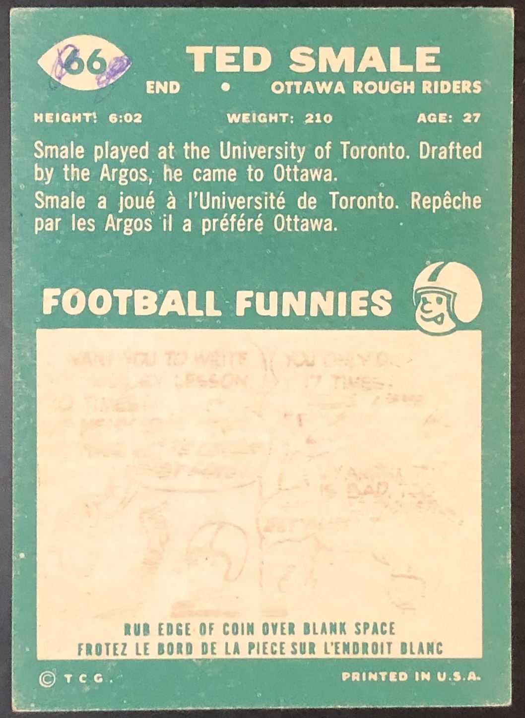 Card #66, some ink on back CFL, football, vintage