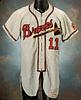 The flannel jersey has the "Wilson" label with the size "40" on the left front tail. In the collar of the jersey is a grey felt strip tag with "McMillan 1961" chain stitch in blue, this tag has very heavy wear and holes. Across the front of the jersey is the name "Braves" in script style letters made of red on black felt. Below this is the Braves "Tomahawk." Below on the left and on the back of the jersey is the player number "11" in red on black felt. On the left sleeve is the Braves multicolored "Indian Head" patch. There is a metal zipper going down the middle of the front of the jersey. The jersey is autographed in the back collar in black marker and rates an 8. The jersey shows heavy game-use and appears to have no alterations of any kind. Accompanied by a LOA from JSA.