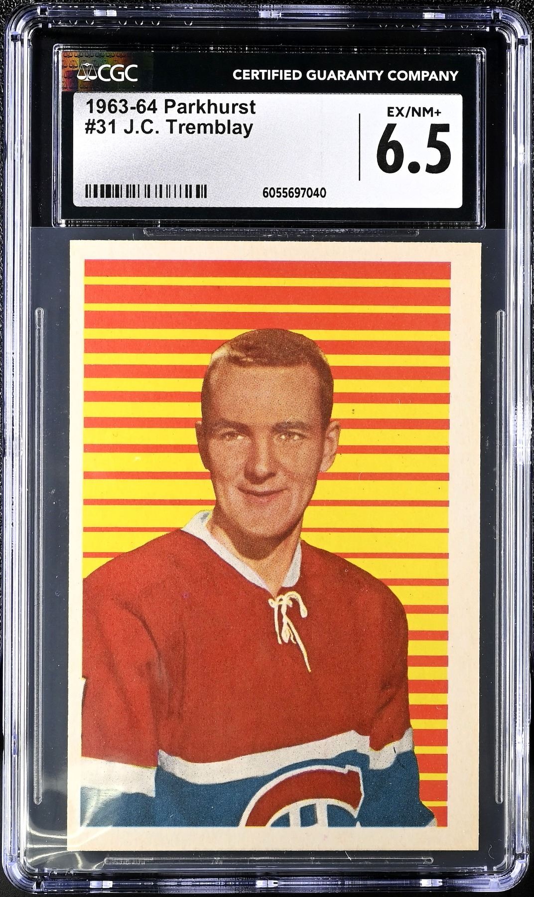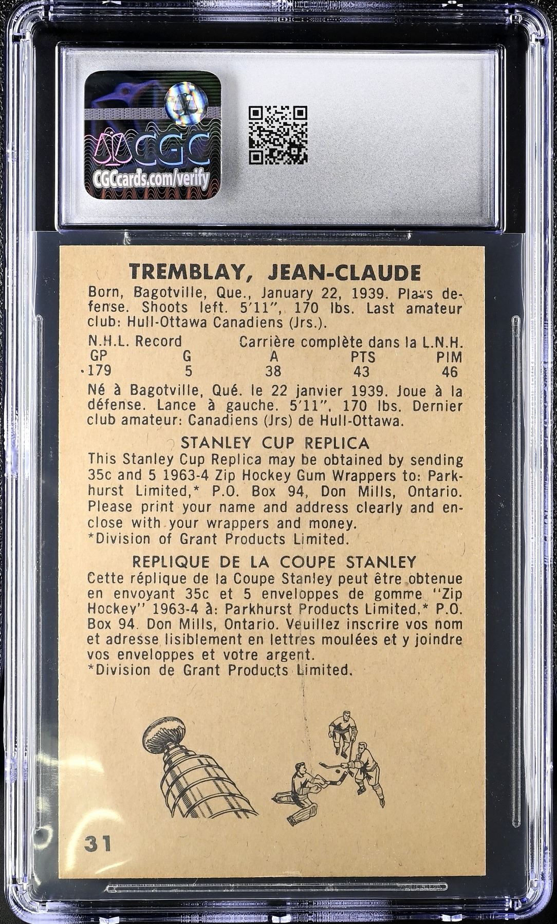 Tremblay was a solid defenseman and a five-time Stanley Cup winner with Montreal. He was a top-5 vote getter for the Norris five times, finishing as runner-up in 1968. Later in his career he jumped to the WHA and was twice named the league's top D-man. Graded a sharp 6.5 EX-NM+ by CGC.
