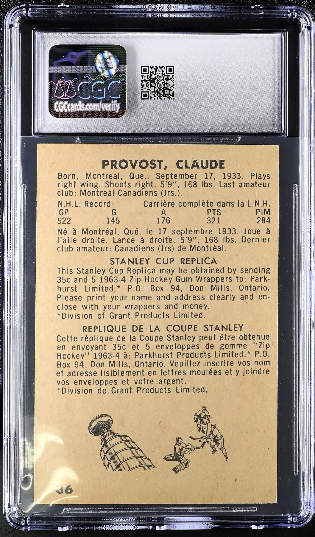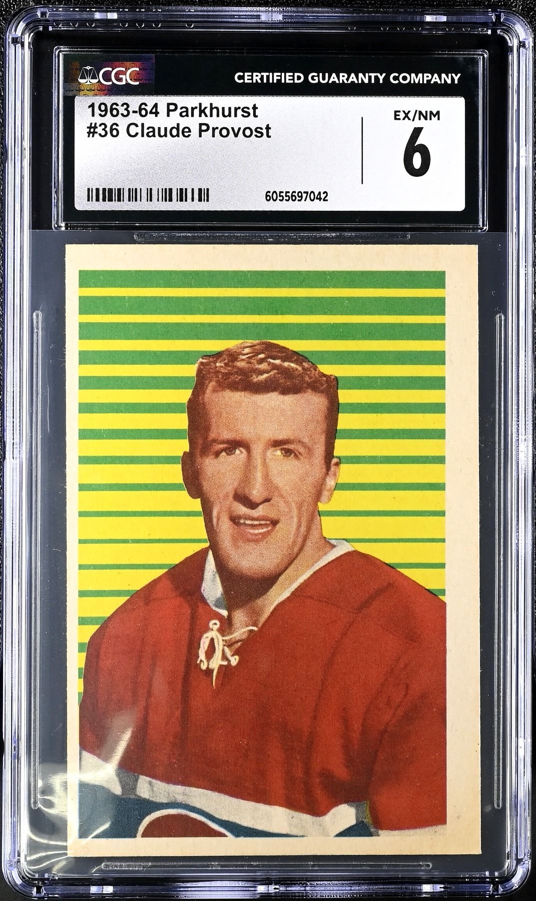 Provost was a premiere two-way forward who played 15 NHL seasons with the Montreal Canadiens, in which he'd make the post season 14 times and win nine Stanley Cups. He made 11 all-star games and won the Masterton award in 1968. Graded 6 EX-NM by CGC.