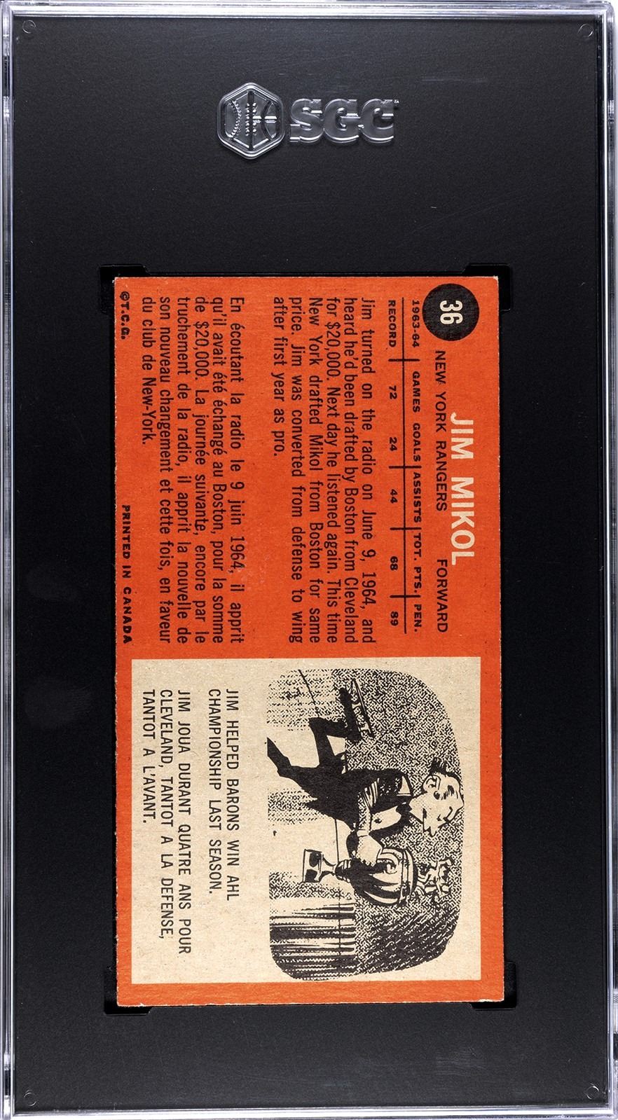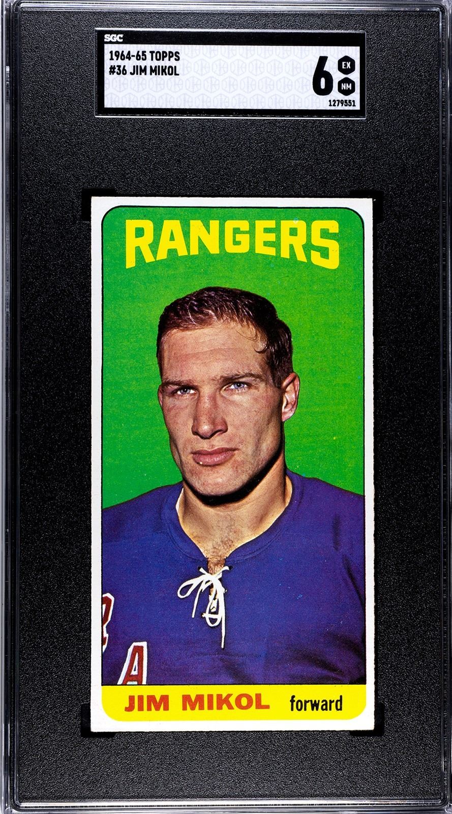 Rookie card of Jim Mikol, who played but 34 NHL games but was a well known minor leaguer who won league titles in the EHL (Johnstown Jets), the AHL (Cleveland Barons) and the CPHL (St. Paul Rangers). Graded a nice 6 EX-NM by SGC.