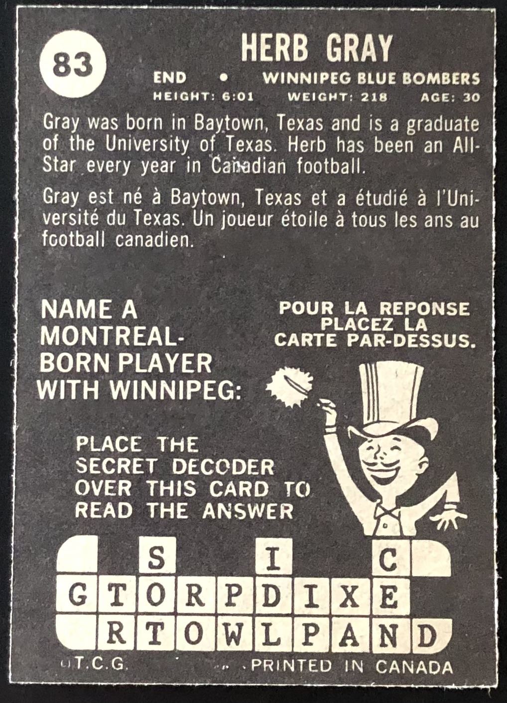 Card #83 vintage, CFL, OPC, football, hall of fame