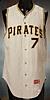 On the left front tail of this vest is the "Rawlings" size "42" manufacturer's label. Below this is the washing instructions label with the "Set 1 1968" flag tag attached. Across the front of the jersey is "PIRATES". The player number "7" appears on the back of the jersey. The letters and numbers are made of black on gold felt. The flannel has a small repair on front. The jersey shows game-use and appears to have no other alterations of any kind.