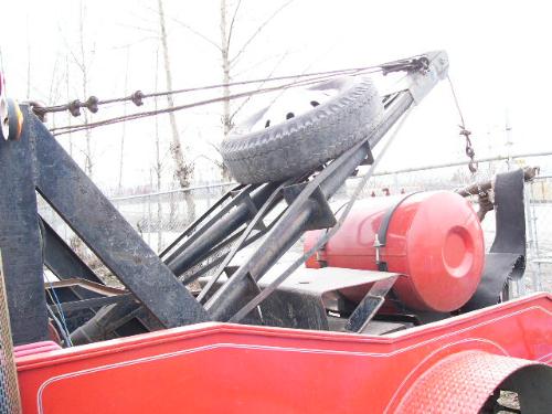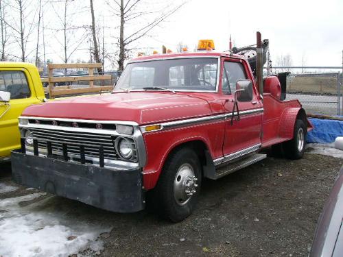1968 Red Ford Ranger XLT tow truck, 4 speed manual transmission, odometer: 158,509, 3/4 ton dually rear end, semi style pipes, custom push bumper, CB phone, Pioneer stereo system, trailer brake controller, new battery, 351 Cleveland engine with Holley 4 barrel carb, HiFlo Moroso air cleaner. Runs, flat rear tire, overheats, has small oil leak VIN #F35YCD20825 (169)