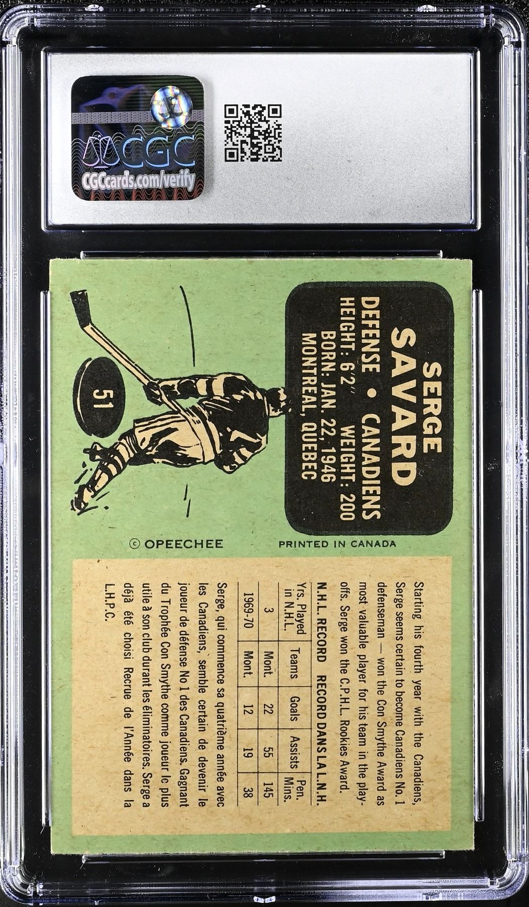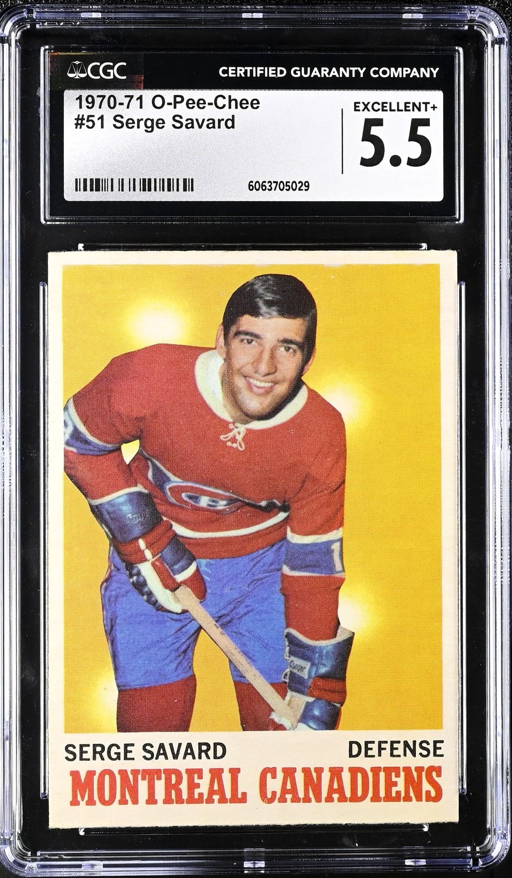 Nice 2nd year card of HOF defenseman, Serge Savard, who won seven Stanley Cups with Montreal, was a Conn Smythe winner as playoff MVP, and winner of the Masterton Trophy. Graded 5.5 EX+ by CGC.