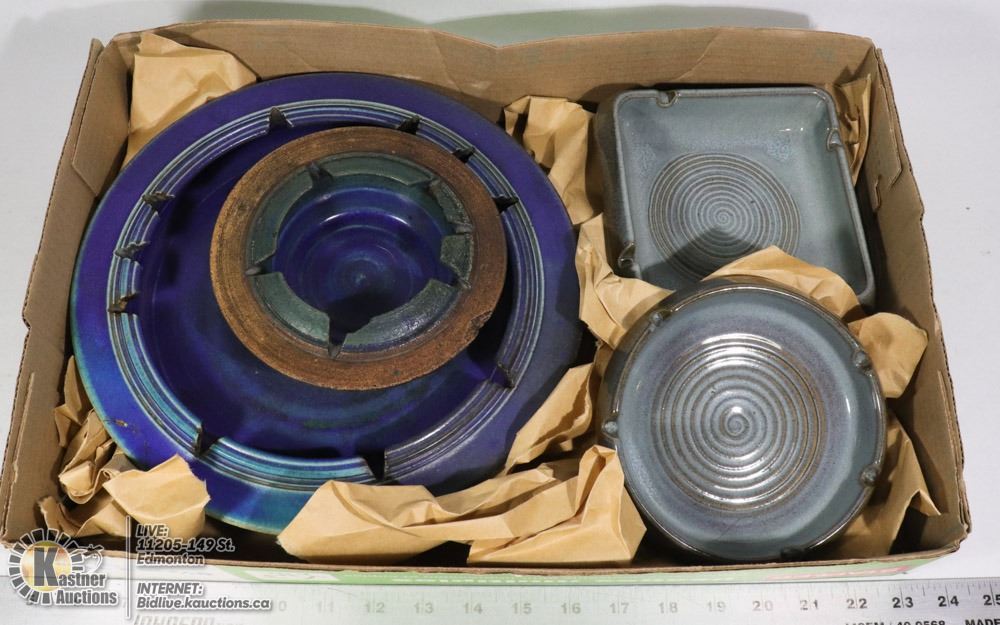 2 POTTERY ASHTRAYS - SIGNED AND DATED 1973. LARGE ROUND IS 11 INCHES IN DIAMETER (1.5 INCH REPAIR PRESENT) SMALL ROUND IS 6.25 INCHES IN DIAMETER (A FEW CHIPS). THE OTHER TWO WITH SHINY GLAZE ARE MARKED