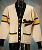 Heavy white wool sweater. Sweater is accented with black and yellow stripes on the sleeves. Six yellow buttons down the middle of the sweater. On the front left beast is a "Bruins NHL" wool patch. The sweater shows nice wear and appears to have no alterations of any kind. Accompanied by a LOA describing the history of the sweater.