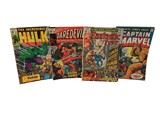 Lot of 4 vintage comics: Fantastic Four The Final Defeat of the Human Race - King Size Special. Vol. 1 #8 from December 1970 (small rip at top cover andmultiple rips on right side with a small piece of scotch tape over that area). Captain Marvel Vol. 1, No. 26 from May, 1973 (water damaged on cover).Daredevil Showdown at Sea Vol. 1, No. 60 from January 1970 (top right tear). The Incredible Hulk Vol. 1, No. 127 from May 1970. All in fair condition.
