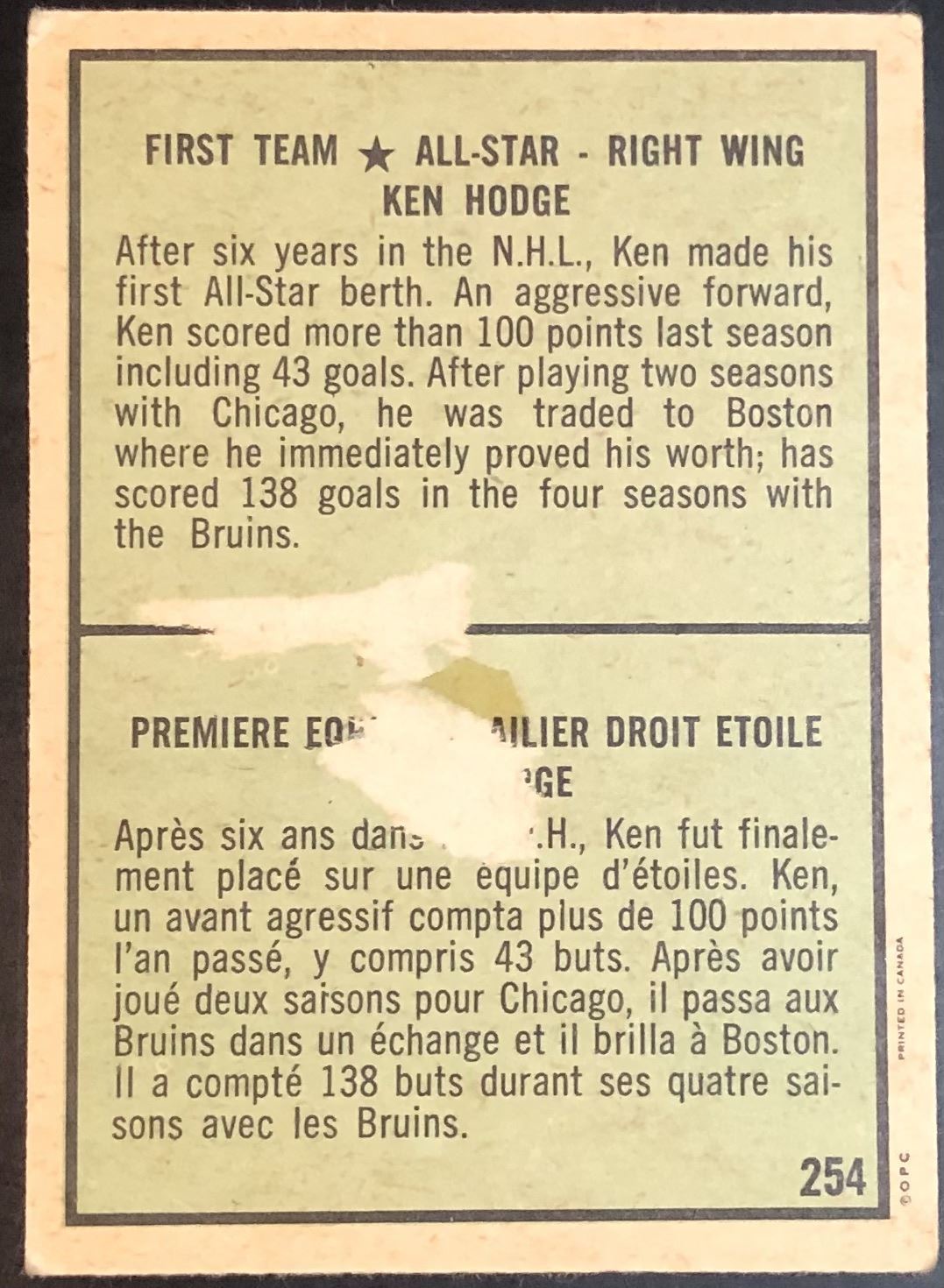 Card #254, paper loss on card back NHL, hockey, OPC, vintage, hall of fame