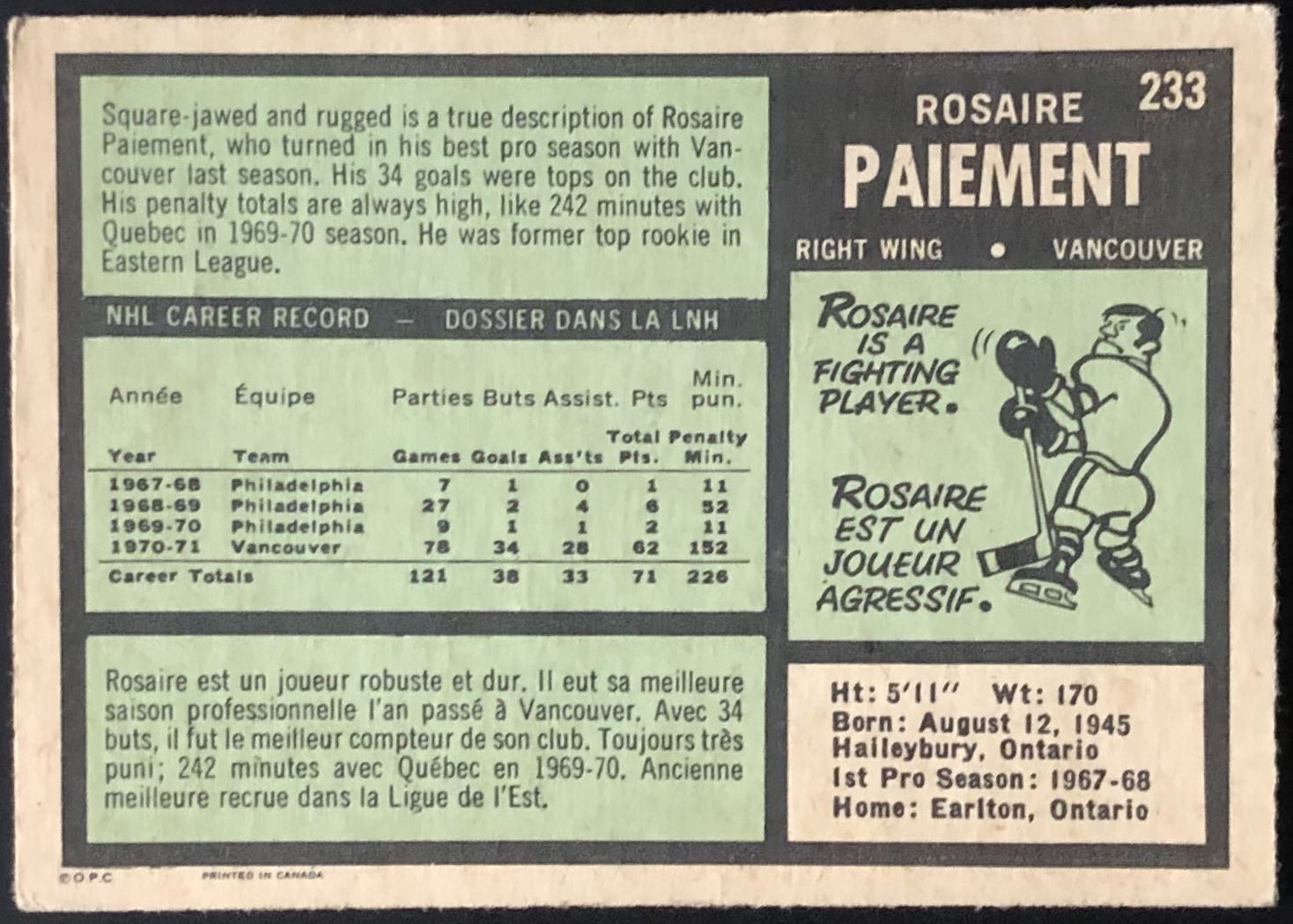 Card #233 NHL, hockey, OPC, vintage, rookie